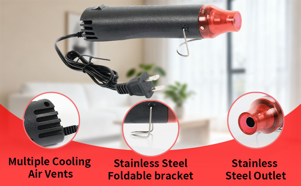 【مواد احترافية】يتميز المسدس الحراري بغرفة داخلية من الفولاذ المقاوم للصدأ مقترنة بغلاف خارجي مقاوم للحرارة من أكريلونتريل بوتادين ستايرين، مما يضمن مقاومة درجات الحرارة العالية ومنع التشوه. يوفر حجمه الصغير 240 مم مع سلك طاقة بطول 3.28 قدم إمكانية النقل ونصف قطر تشغيل ممتد. يمنع المقبض غير القابل للانزلاق وفتحات التهوية الخلفية ارتفاع درجة الحرارة أثناء الاستخدام المستمر.