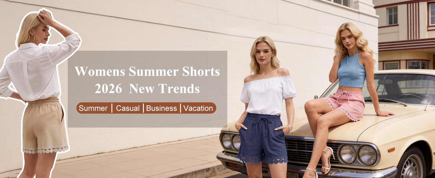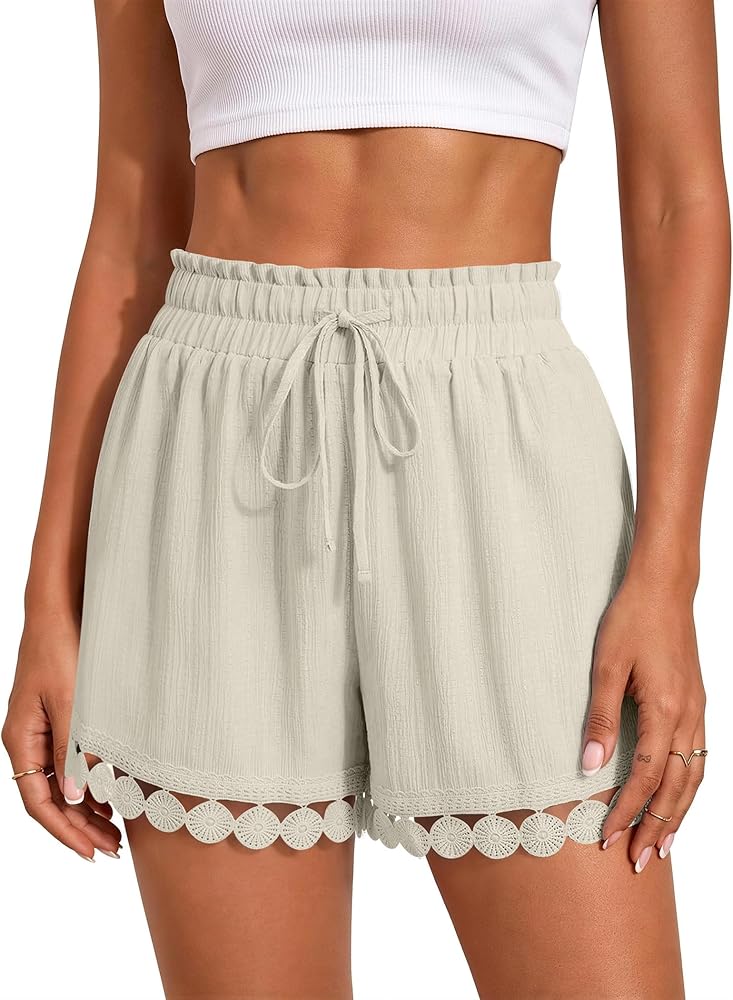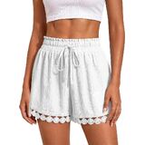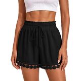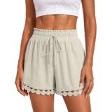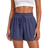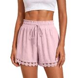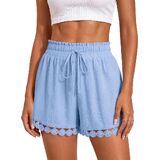تصميم عصري لشورت الصيف: لون موحد، فضفاض، أنيق بوهو، ساق واسعة، جيوب جانبية تقليدية، خصر مرن برباط يجعل هذا الشورت الكاجوال سهل الارتداء، حزام خصر مكشكش وتصميم حاشية من الدانتيل يضيف لمسة من الأناقة