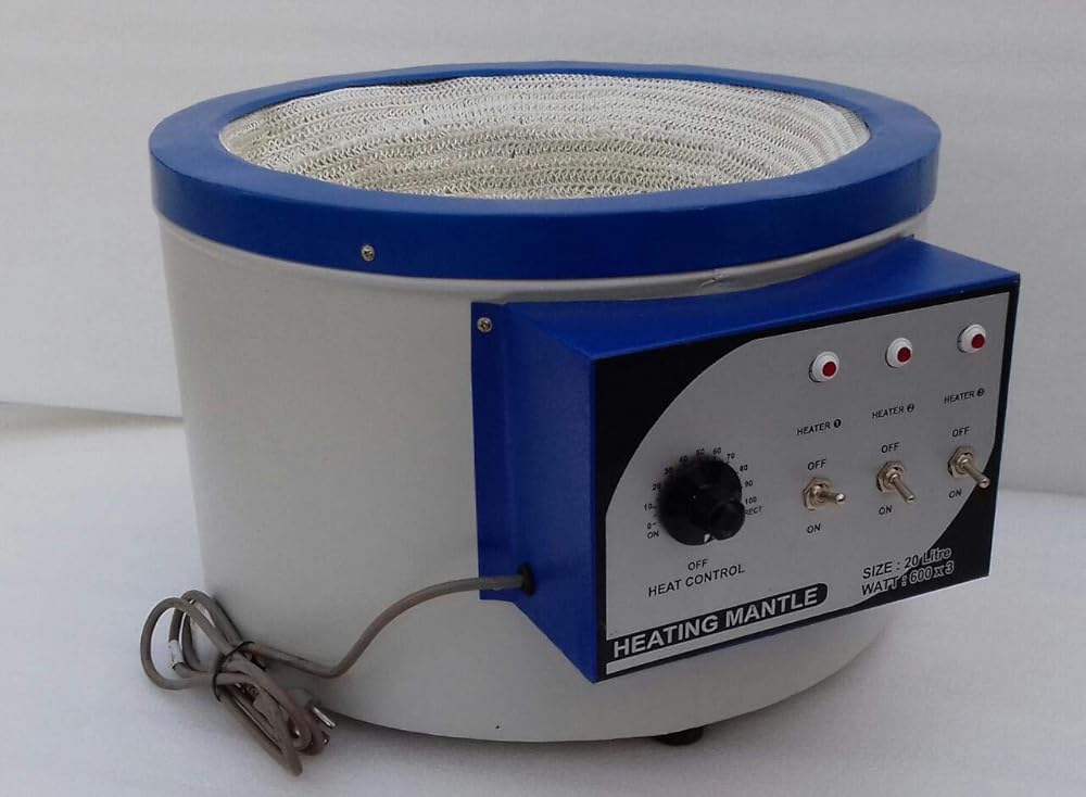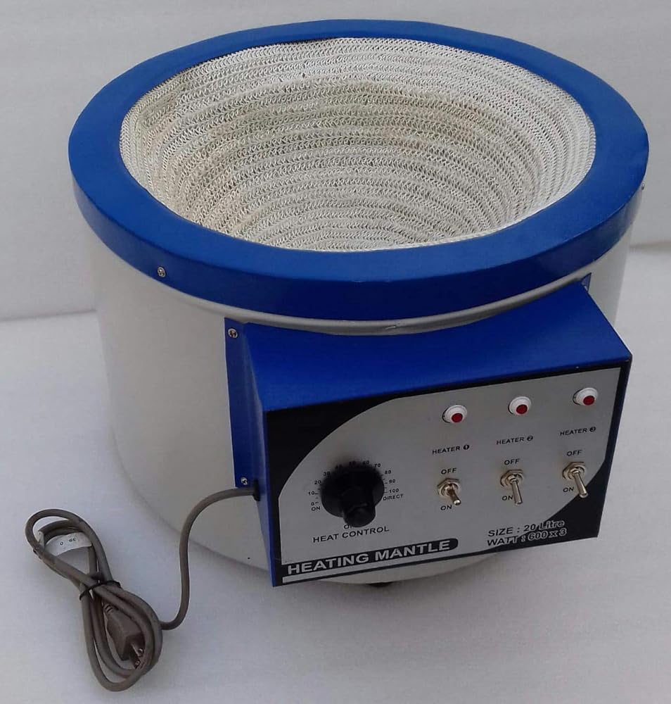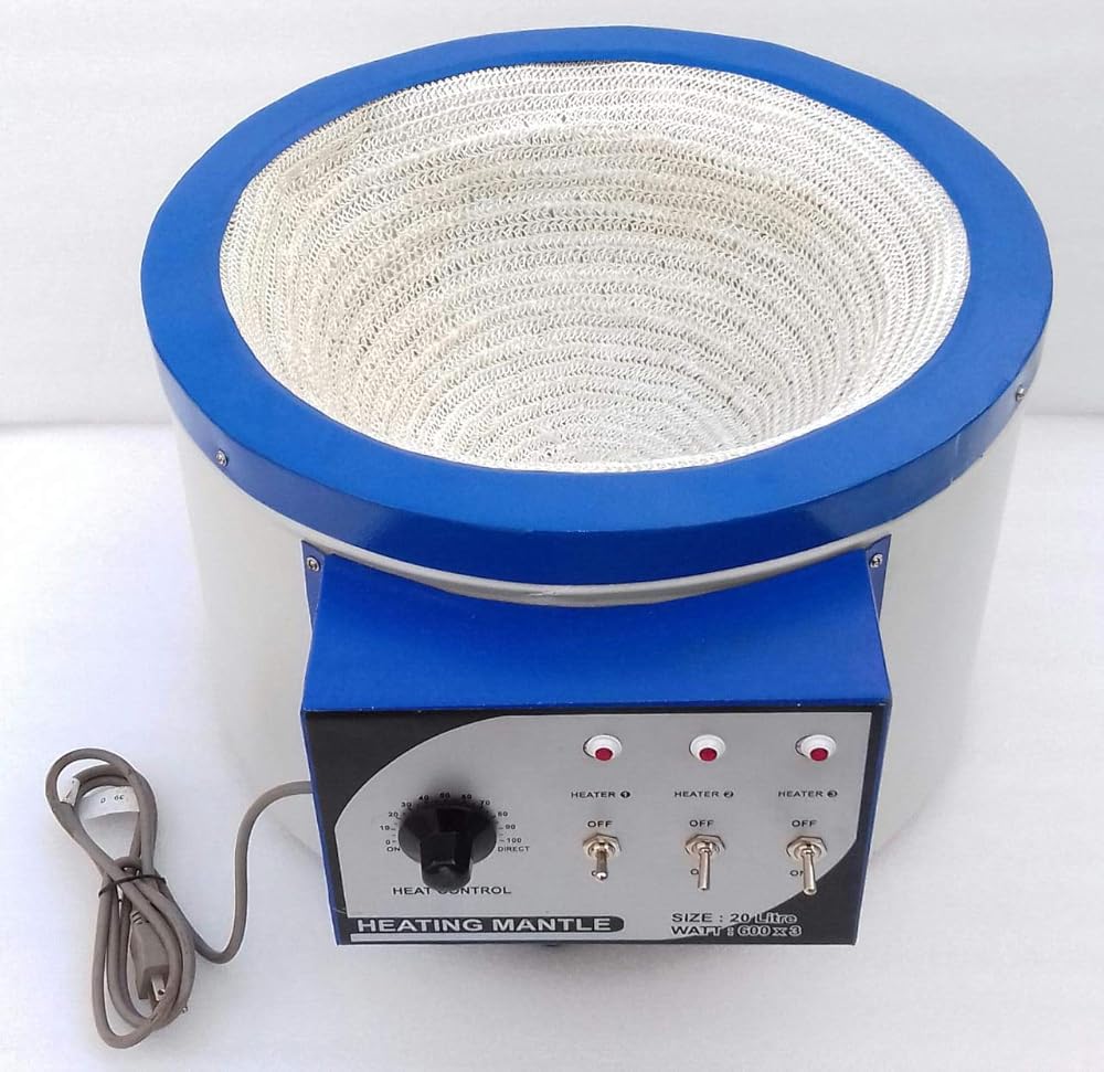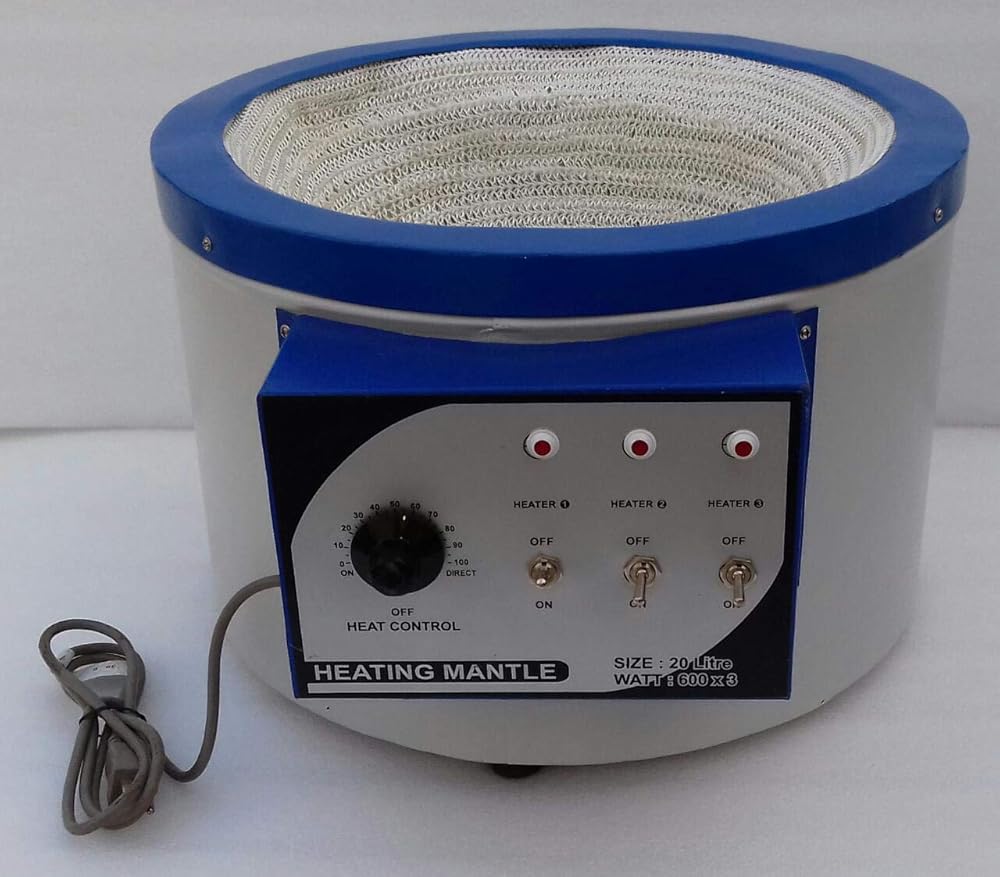 Heating Mantle Size : Height 18.5 x 22 x 13 inches Wattage : 1800 Made with sturdy aluminum body and is logged with special mineral wool. The panel is provided with an on-off switch, an energy control knob with a pilot lamp. A single circuit system has been adopted and a proper electric wiring in this mantle makes certain that no short circuit takes place.