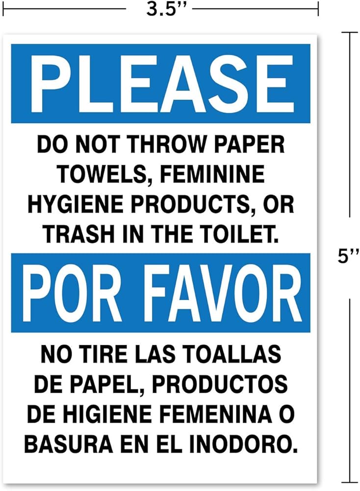 (عبوتان) يرجى: عدم رمي المناشف الورقية أو منتجات النظافة النسائية أو القمامة في ملصق الفينيل الخاص بالمرحاض. 3.5 × 5 بوصة ثنائي اللغة. Por Favor No Tirar Las Toallas De Papel o Basura