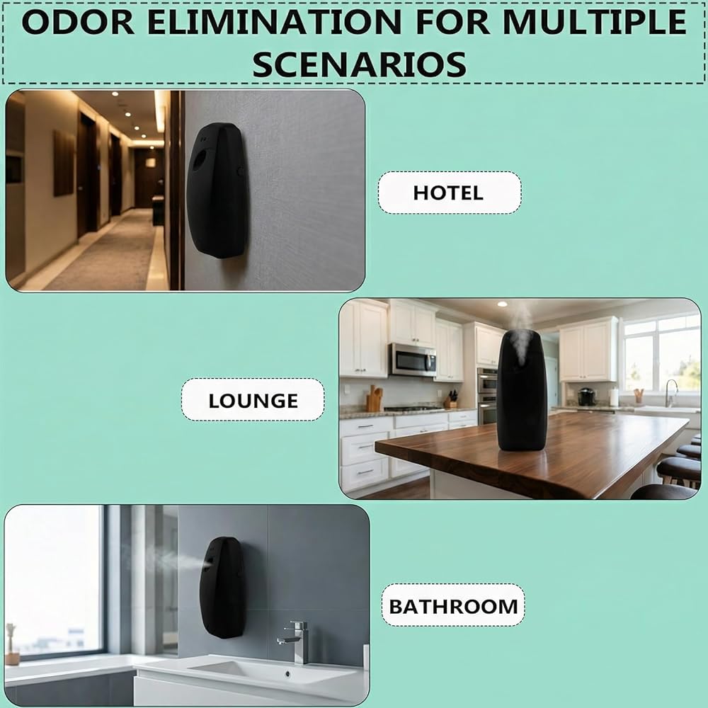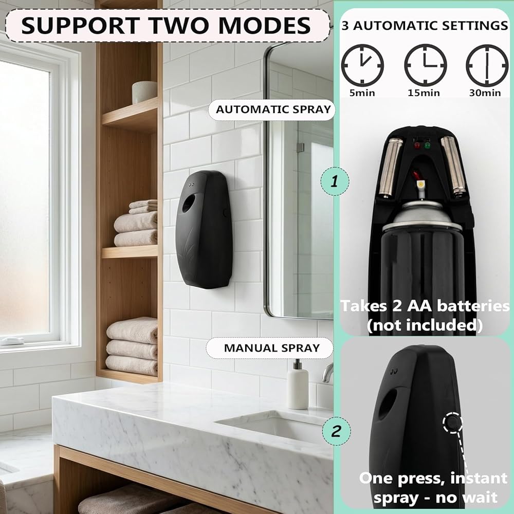 موزع معطر هواء أوتوماتيكي - عبوتان من رذاذ الرذاذ المثبت على الحائط للمنزل والحمام والمكتب - بخاخ رائحة يعمل بالبطارية متوافق مع معطرات الهواء التجارية (أسود)