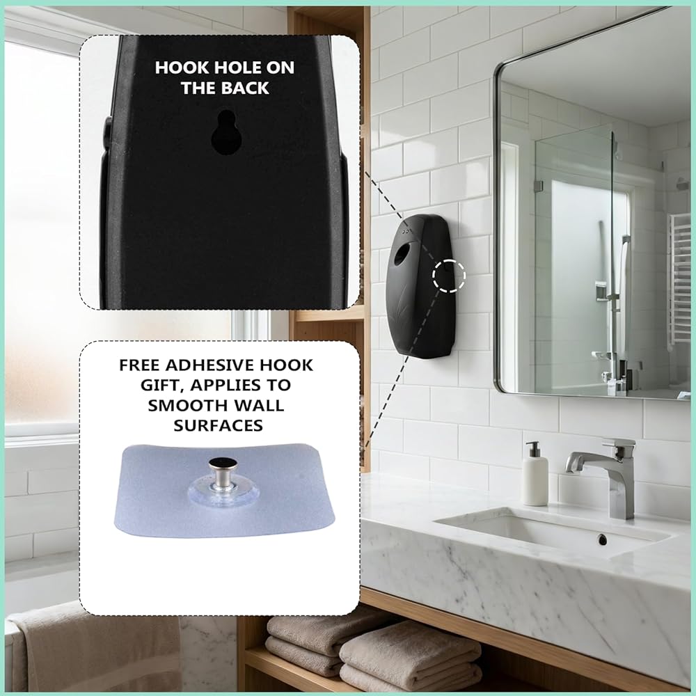 Wall mounted or standalone design: This multifunctional air freshener dispenser has a standard hook hole at the back and comes with a free hook that can be installed on the wall or used as a desktop unit, making it perfect for bathrooms, bedrooms, kitchens, or commercial spaces.