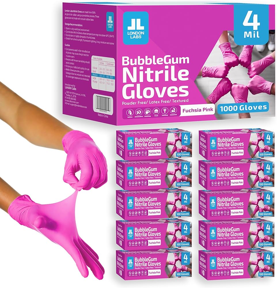London Labs 4 مل - قفازات نيتريل وردية فوشيا - خالية من اللاتكس وخالية من البودرة - مقاومة للمواد الكيميائية، قفازات مطاطية وردية in Kuwait