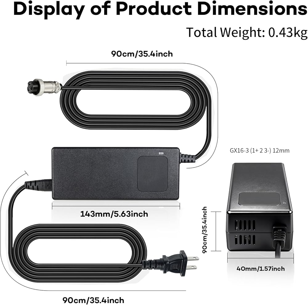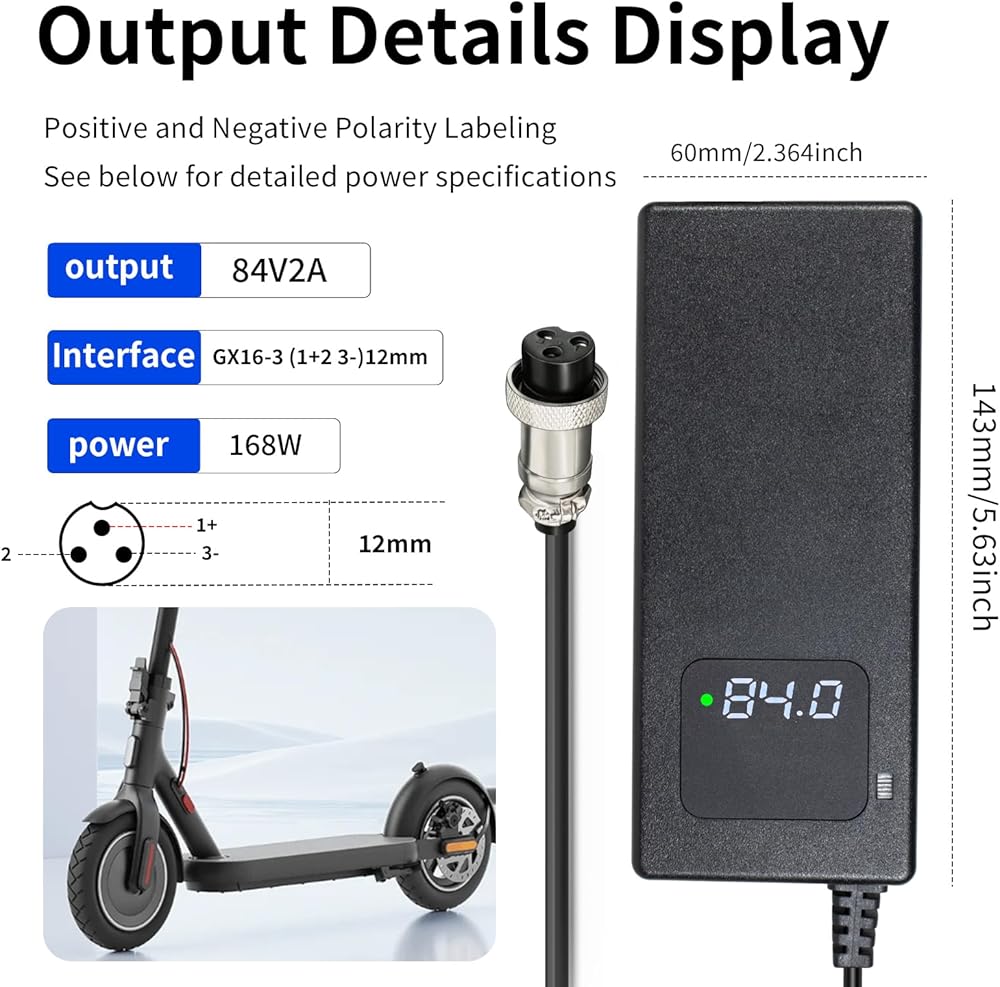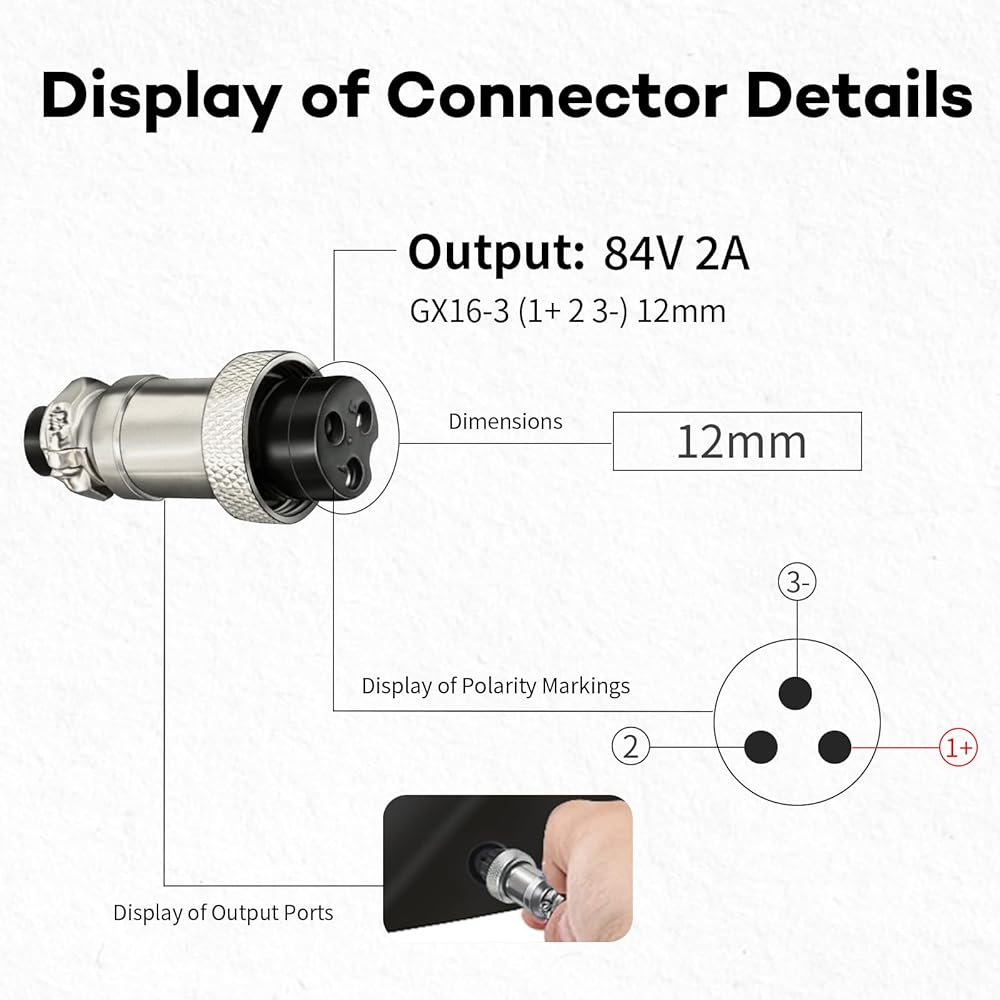 • Product Specifications: This smart charger is designed for lithium batteries with a battery voltage of 72V. Charging voltage: 84V, Charging current: 2A, Input voltage: 100V-240V AC 47-63Hz,gvailable for gx16-3 female 1+ 2-/3-.