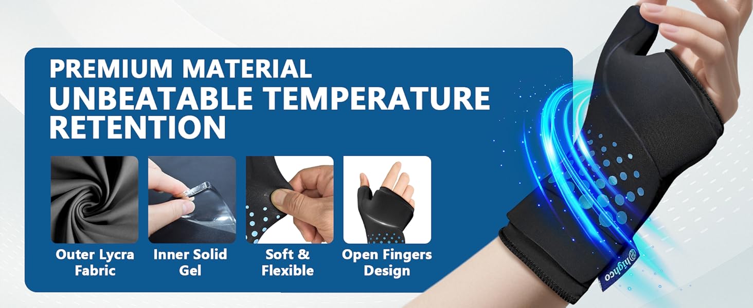 راحة مطورة تدوم طويلاً: يضمن قفاز النفق الرسغي الذي يلتف على شكل كيس ثلج متانة طويلة الأمد، كما أن الجل الطبي ونسيج الحرير الجليدي، السميك للمعصم والإبهام، يطيل وقت التبريد، ويوفر تخفيفًا مستدامًا وفعالاً للألم، ويسرع عملية الشفاء.