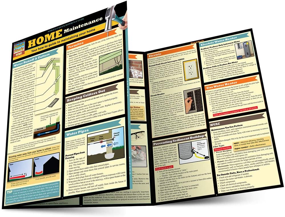 Keep your home maintained and safe with BarCharts' new Home Maintenance guide. This three-panel guide, complete with handy illustrations, diagrams, and charts, features tips and techniques for maintaining your home―inside and out. Termite and pest control, leaks, toilet maintenance, and smoke detectors are just some of the topics covered in this handy reference. This guide is a great gift for new homeowners and a valuable resource for anyone wanting to keep their home in tip-top shape and prevent costly repairs.