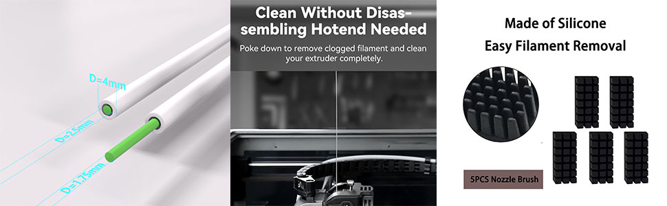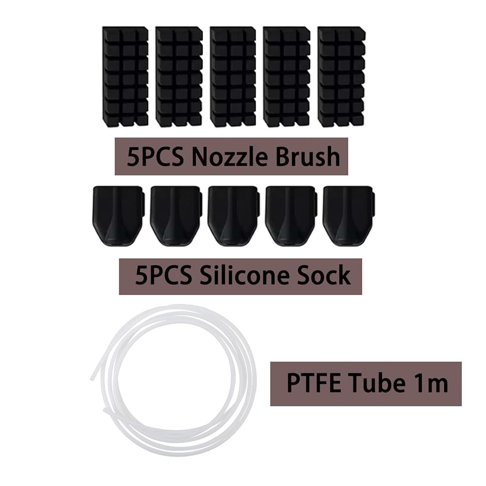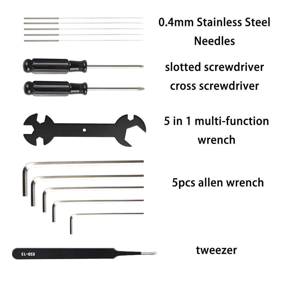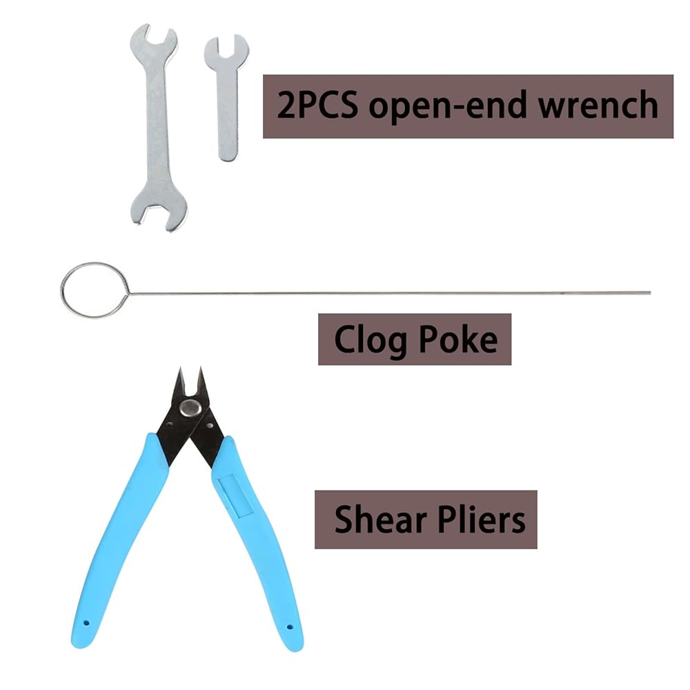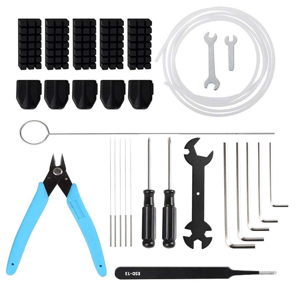 - تشتمل مجموعة أدوات الطابعة ثلاثية الأبعاد على: 5 قطع جوارب سيليكون، 5 قطع فرشاة فوهة، أنبوب PTFE 1 متر (2.5 مم معرف × 4 مم OD)، كماشة مقص، مفك براغي مشقوق، مفك براغي متقاطع، ملقط، 5 قطع إبر من الفولاذ المقاوم للصدأ 0.4 مم، 2 قطعة مفتاح ربط مفتوح، كزة سدادة، مفتاح ربط متعدد الوظائف 5 في 1، 5 قطع مفتاح ألين.