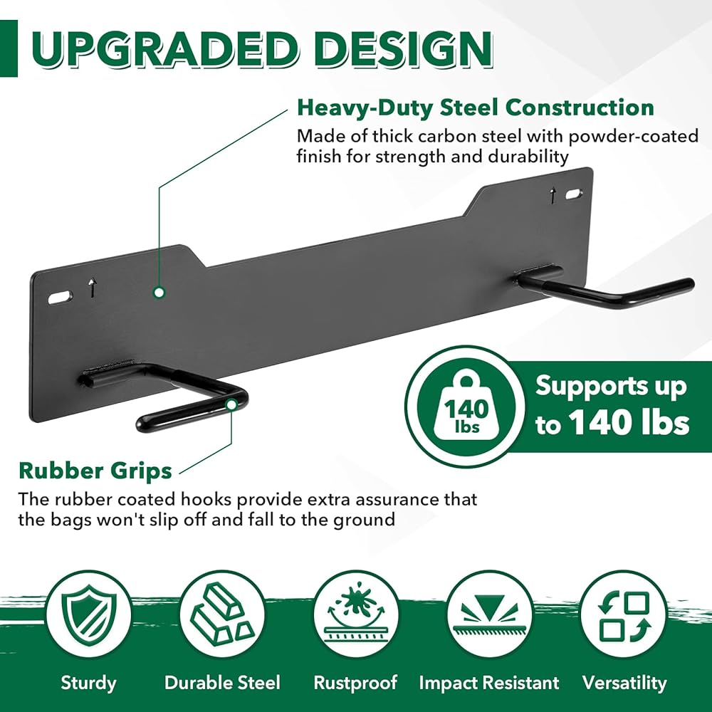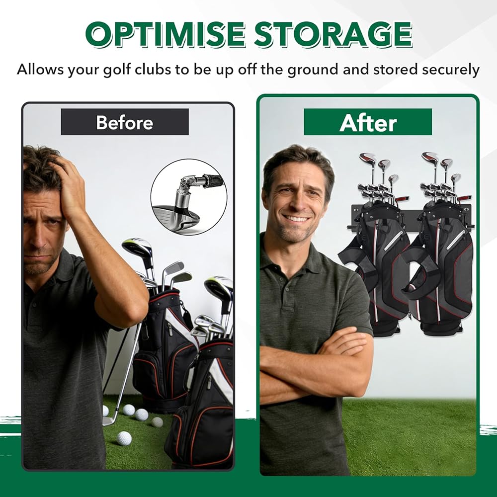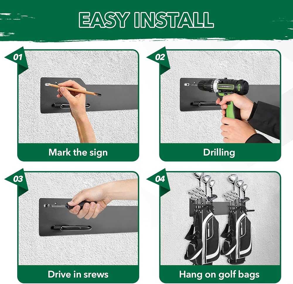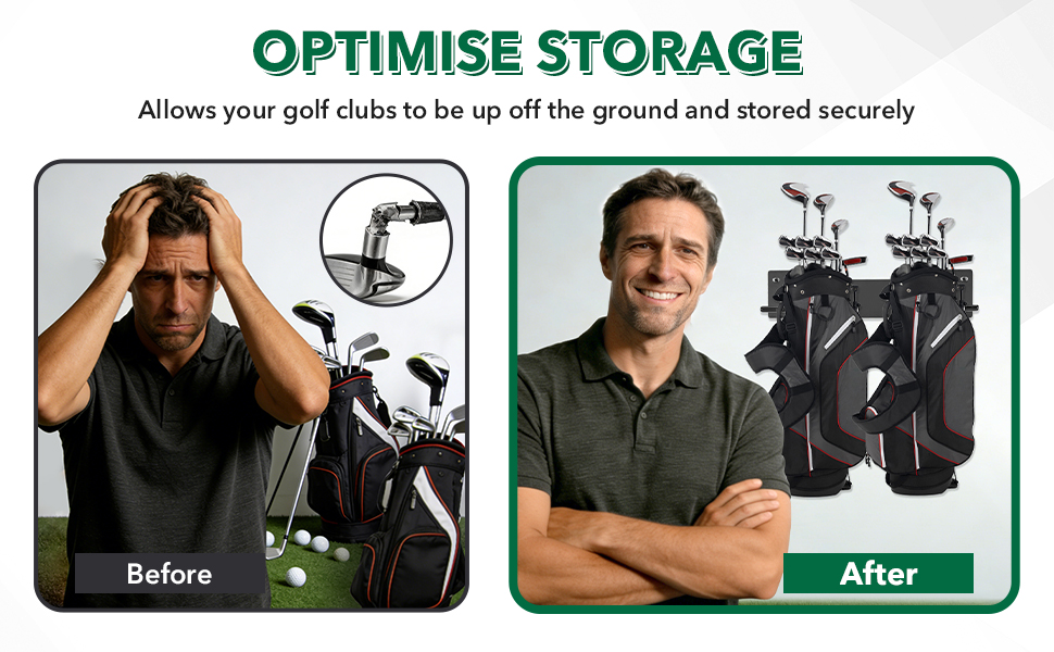 زيادة المساحة: تصميم مثبت على الحائط بقضيب مزدوج يخزن حقيبتي جولف بشكل آمن عن الأرض، مما يحرر مساحة الأرضية على الفور ويحافظ على المرآب أو منطقة التخزين الخاصة بك نظيفة ومنظمة