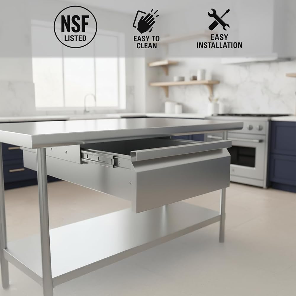 • Heavy-Duty Metal Drawer – Features an 18-gauge 430 stainless steel front with an 18-gauge galvanized steel body for durability in commercial environments.