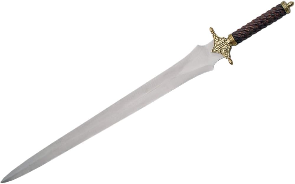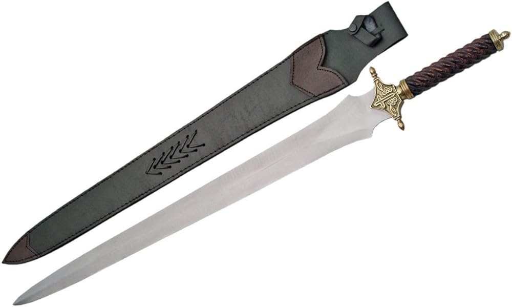 You really need to hold this one in your hand to appreciate the balance and control you will have with it. It is very well balanced.The handle is a spiral of dark cherry wood with hints of gray.The brass hilt has a cross on it.This sword comes with a custom leather sheath.