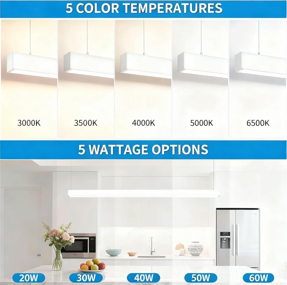 5 Watts Adjustable and Higher Brightness: the LED Linear Light Fixture offers 5 wattage options – 60W/50W/40W/30W/ and 20W, it yields up to 7800 Lumens of brilliant brightness using only 60 watts. It's also 0-10V Dimmable for your different brightness demands without flickering.