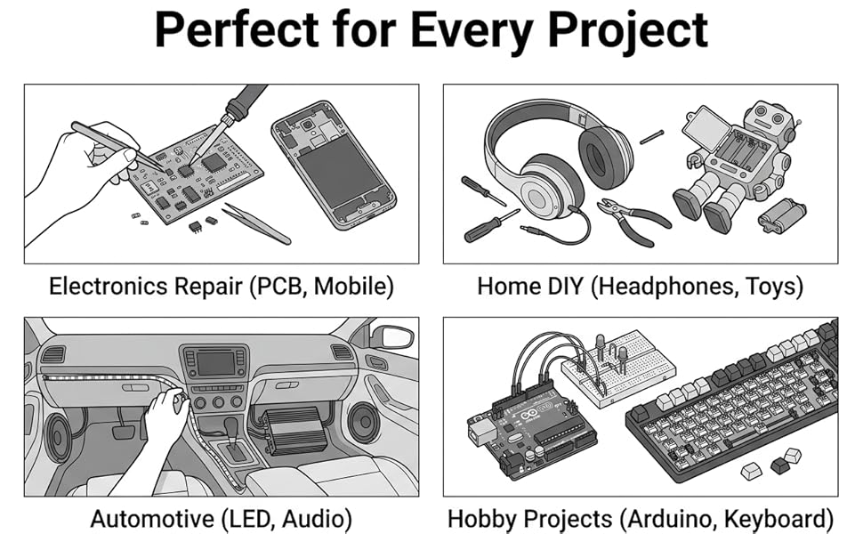 • جيد للوحات الدوائر وأجهزة التلفاز والثلاجات وأجهزة التكييف وأجهزة الراديو والمشروعات اليدوية وإصلاح المكونات الإلكترونية والإصلاحات الكهربائية وإصلاح الهاتف وما إلى ذلك.
