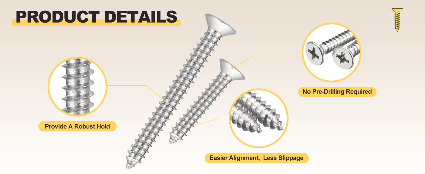 [1]: تنطبق على - مصممة لإصلاح الأثاث، وتجميع الأعمال الخشبية، والمشروعات المنزلية التي تصنعها بنفسك، مثل تقوية الكراسي والطاولات، أو تعديل مفصلات الخزانة، أو تثبيت شرائح الأدراج، أو الانضمام إلى إطارات الصور، أو تأمين القطع الخشبية المزخرفة. يتم وضع تصميم الرأس المسطح في فتحات غاطسة مثقوبة مسبقًا، مما يضمن لمسة نهائية ناعمة وغير مزعجة للإصلاحات الجمالية.