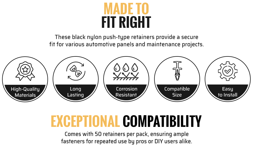 𝗛𝗜𝗚𝗛-𝗤𝗨𝗔𝗟𝗜𝗧𝗬 𝗖𝗢𝗡𝗦𝗧𝗥𝗨𝗖𝗧𝗜𝗢𝗡: هذه المثبتات من نوع الدفع مصنوعة من النايلون الأسود عالي الجودة. توفر هذه المثبتات قوة ممتازة ومقاومة للتآكل وأداء طويل الأمد، مما يجعلها مناسبة للمحترفين وعشاق الأعمال اليدوية.