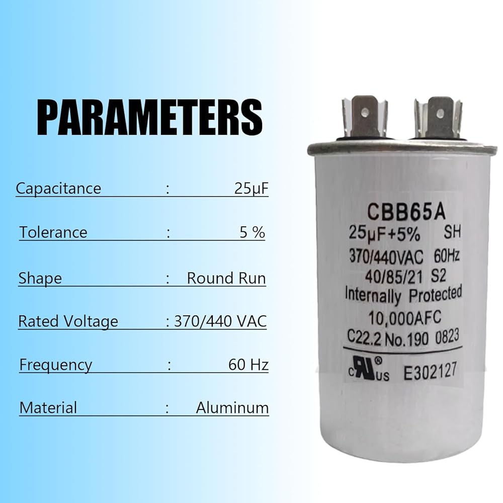 25uF 25MFD 50/60Hz 370VAC 440VAC CBB65 Round Run Start Capacitors for AC Motor Operation, AC Motor Operation, Fan Start, Cooling or Heat Pump Air Conditioning Capacitors.