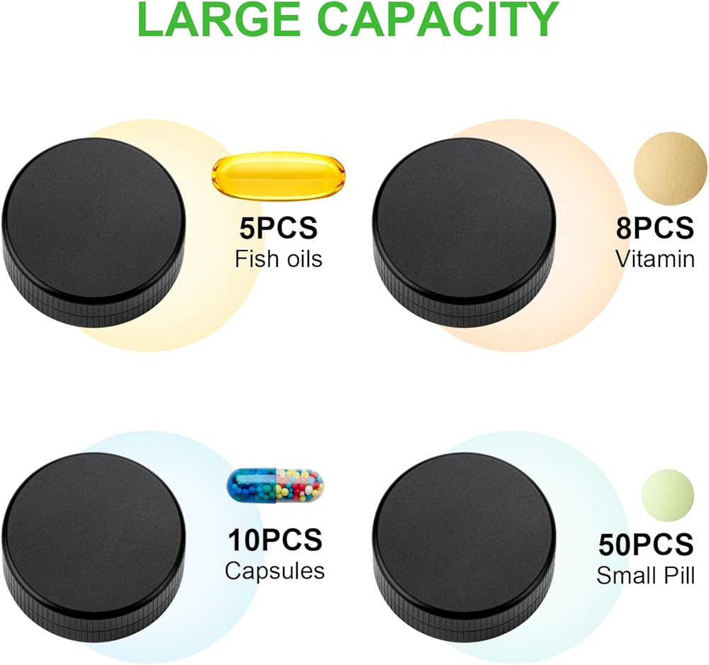 • 【سعة كبيرة】- يمكن لعلبة حبوب الدواء المعدنية الخاصة بنا أن تحمل ما يصل إلى 5 قطع من زيوت السمك أو 12 قطعة كبسولة. حامل حبوب صغير مناسب للحبوب الصغيرة أو الجرعة اليومية.