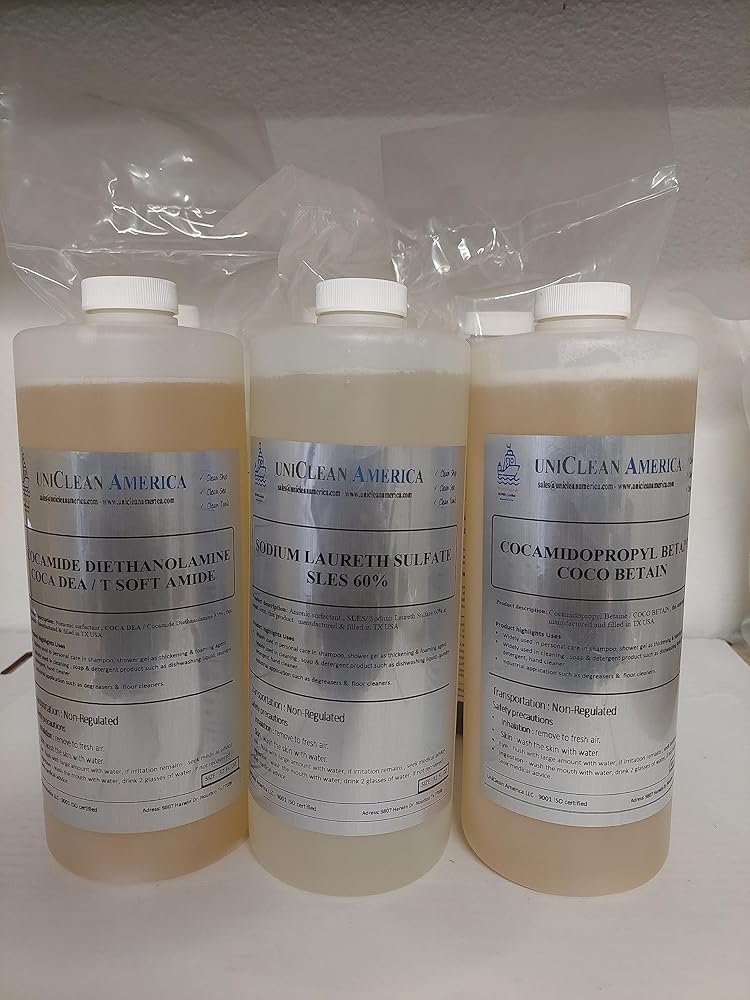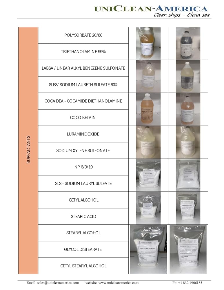 UniClean America provides full range of surfactants anionic, cataionic, non ionic & amphotric surfactants used in all types of making personal, cosmetics and industrial use such as soap, detergents, shampoo, industrial cleanerss & degreasers in small size bottles from 16 fl oz to 128 fl oz.