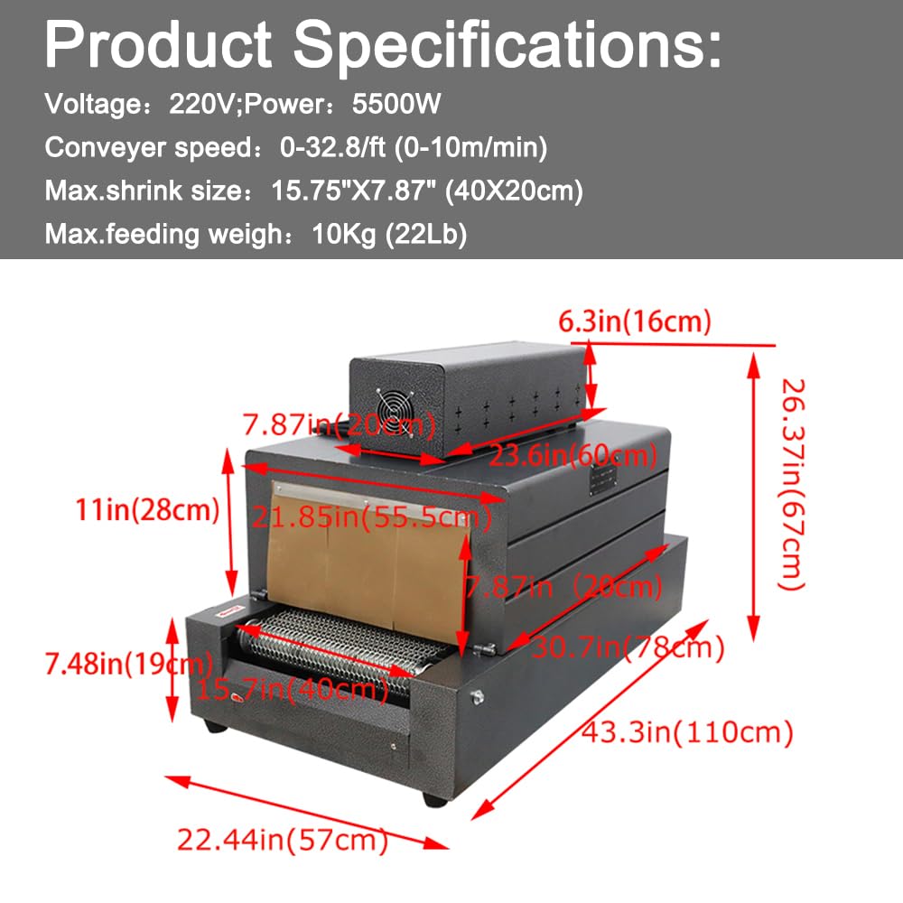 • 【المعلمة: الجهد الكهربي: 220 فولت، الطاقة: 4500 وات؛ سرعة الناقل: 0-32.8/قدم (0-10 م/دقيقة)؛ الحد الأقصى لحجم الانكماش: 11.8 بوصة × 5.91 بوصة (30 × 15 سم)؛ الحد الأقصى لوزن التغذية: 15 كجم (33 رطل)؛ حجم الماكينة: 43.3 × 18.5 × 24 بوصة.