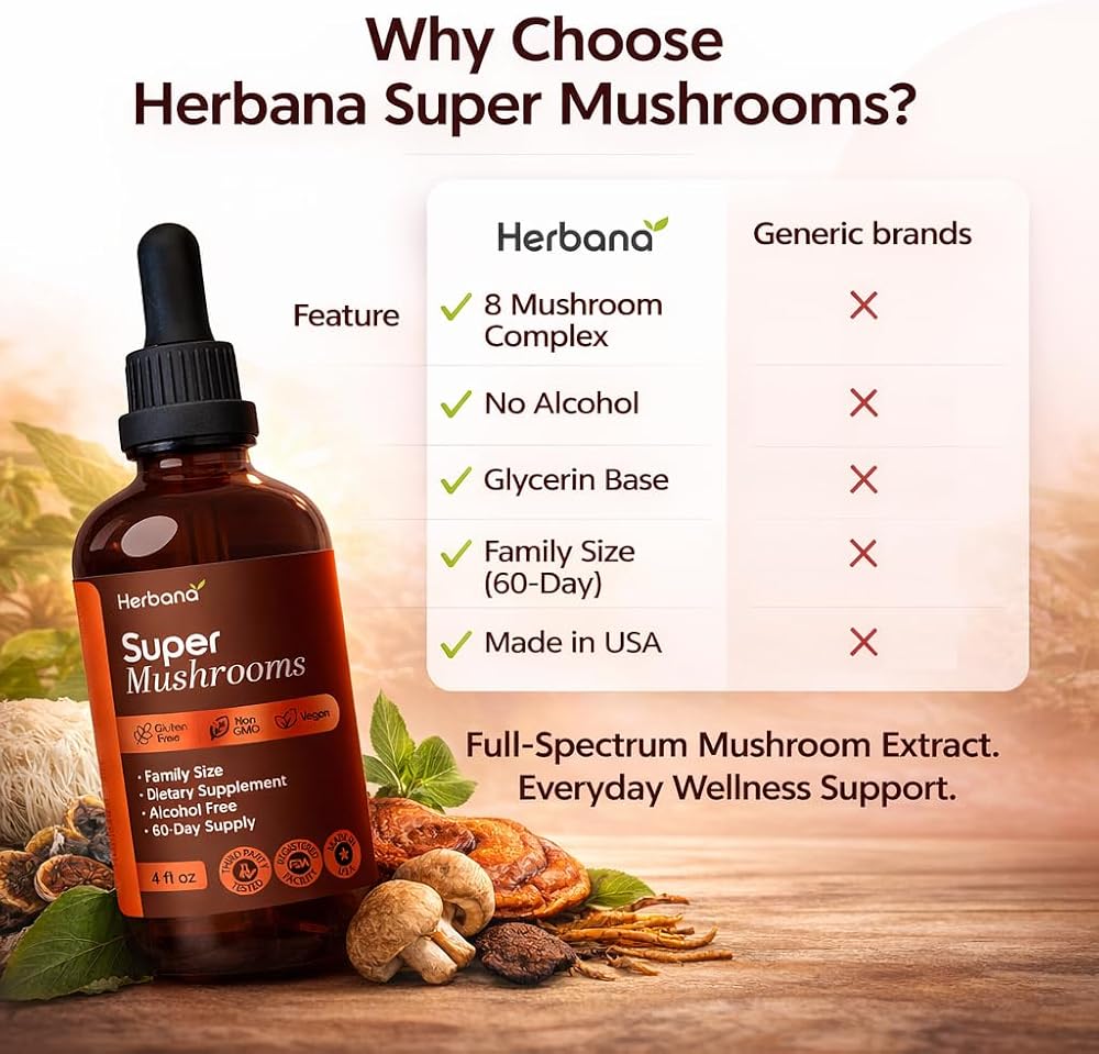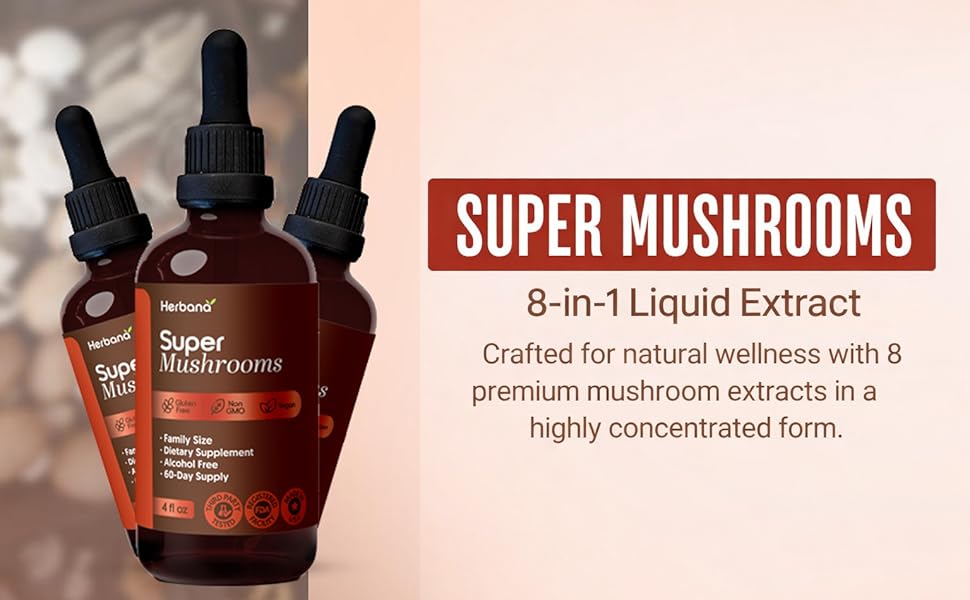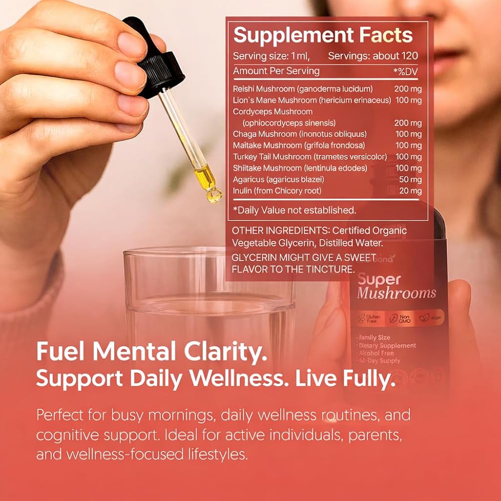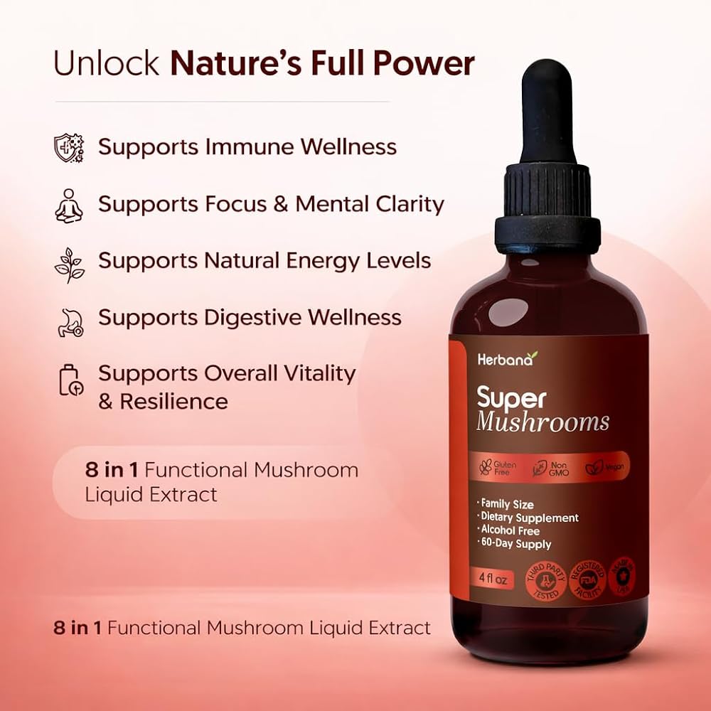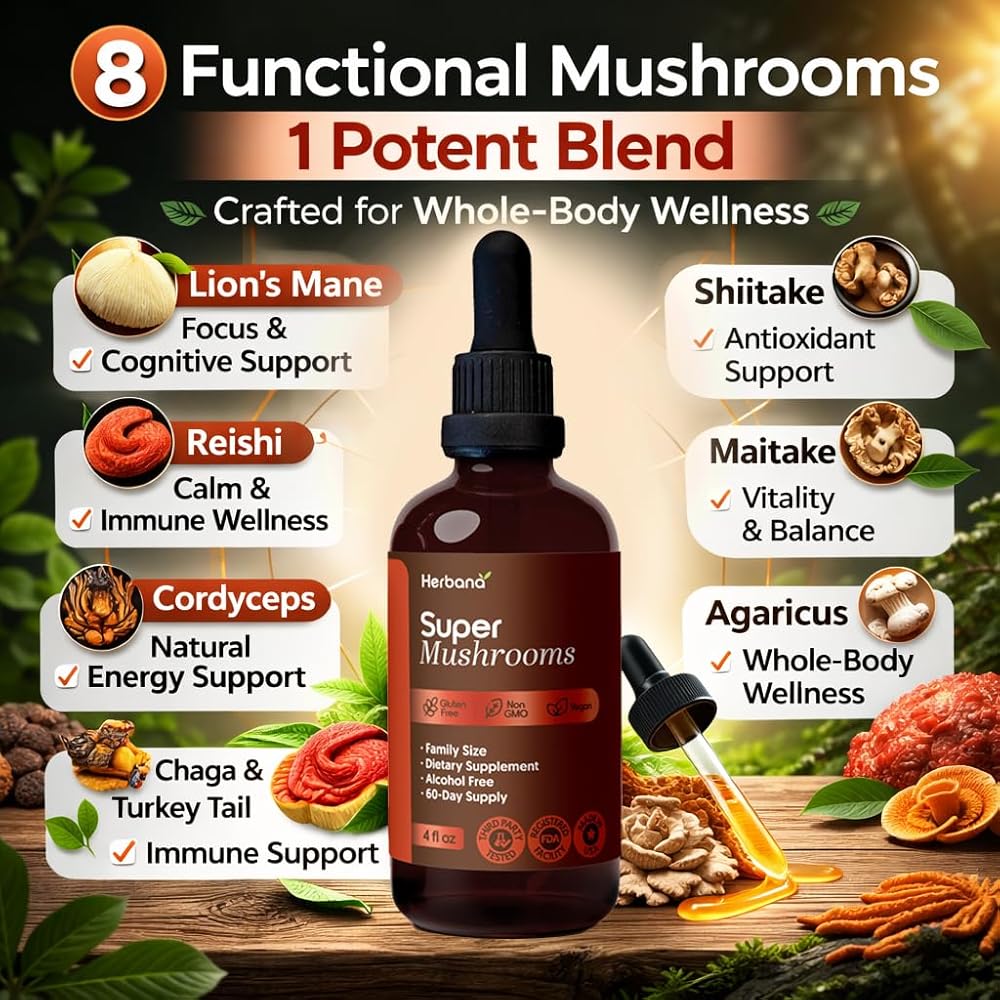مزيج كامل من 8 فطر في مستخلص سائل واحد، مركب فطر قوي يضم الريشي، وعرف الأسد، والكورديسيبس، والشاجا، والمايتاكي، وذيل الديك الرومي، والشيتاكي، والأجاريكوس في شكل سائل مناسب لدعم الصحة اليومية.