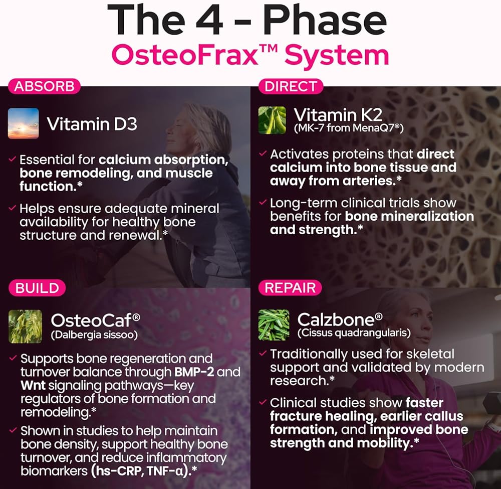 نظام دعم العظام رباعي المراحل - الامتصاص (D3) ← المباشر (K2 MK-7) ← البناء (OsteoCaf) ← الدعم (Cissus Quadrangularis) من أجل صحة العظام الشاملة، وهو مكمل يومي آمن لمساعدة النساء على الحفاظ على عظام قوية وصحية بشكل طبيعي*