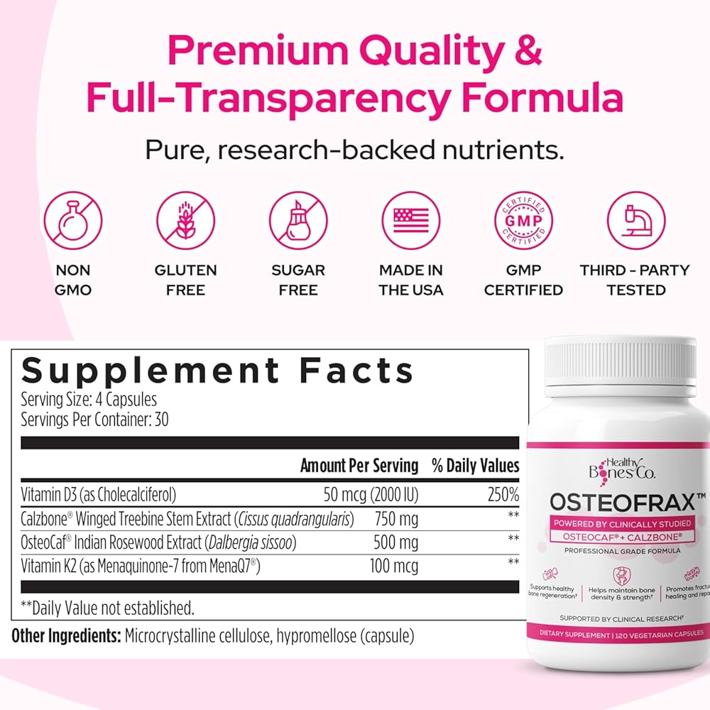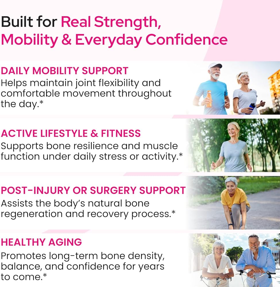 تركيبة نظيفة وموثوقة - صُنعت في الولايات المتحدة الأمريكية في منشأة معتمدة من GMP ومسجلة لدى إدارة الغذاء والدواء. مكمل غذائي لدعم العظام غير معدل وراثيًا وخالي من الغلوتين ومنتجات الألبان والسكر للنساء والرجال