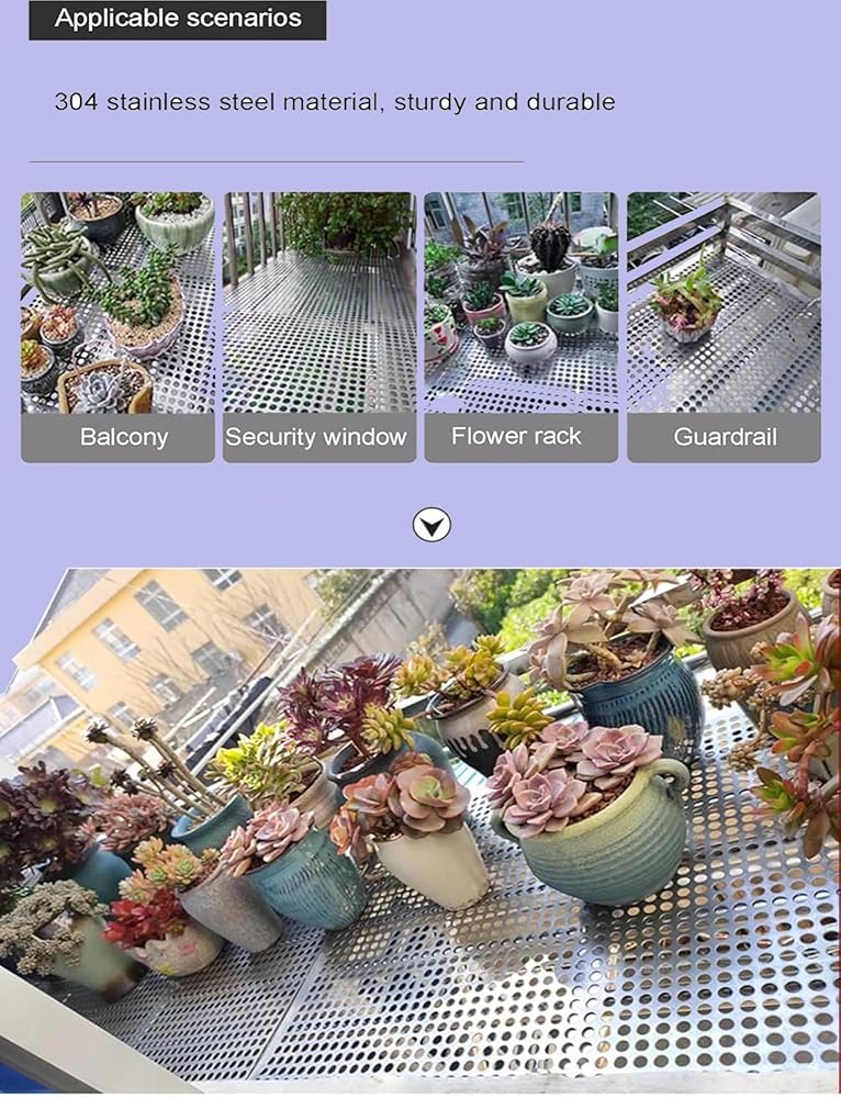 This stainless steel perforated plate is an essential safety solution for balconies, railings, stairs, gardens, windows, courtyards, and terraces. Crafted from durable 304 stainless steel, it combines functionality with style, providing a protective barrier that enhances safety while also serving as a decorative element. With a thickness of 0.8mm and 10mm apertures, this plate is designed to prevent falls and leaks, ensuring peace of mind for families and pet owners alike. The thoughtfully designed round holes allow for secure installation with the included cable ties, making it easy to set up and ensuring a firm grip. This feature not only enhances safety but also deters theft, making it ideal for urban living. The plate's versatility extends to its ability to support potted plants, succulents, shoes, and other items, maximizing your available space while keeping your environment tidy. Custom sizes are available to fit your specific needs, ensuring that you can find the perfect solution for your home. Each package includes one protective net along with essential accessories such as cable ties and gloves, making installation straightforward and hassle-free. Please note that the listing only includes the stainless steel mesh; additional items shown are for display purposes only. Upgrade your home safety and style with this practical and attractive stainless steel perforated plate.