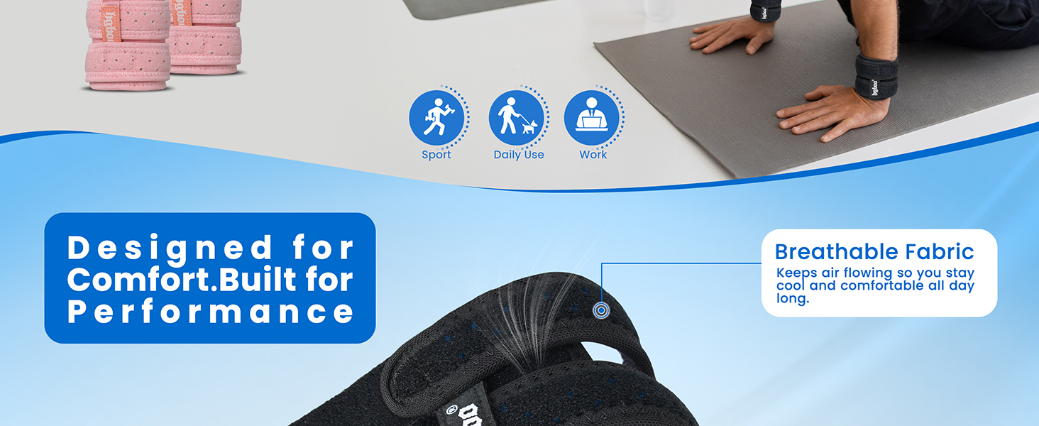 نسيج مسامي وخفيف الوزن للارتداء طوال اليوم: يستخدم الجسم الرئيسي مادة خفيفة الوزن وجيدة التهوية ومثقبة للغاية تساعد على التخلص من الرطوبة والحفاظ على بشرتك باردة وجافة. يقلل هذا التصميم المسامي من تراكم العرق والانزعاج، لذلك يمكنك ارتداء دعامة المعصم بشكل مريح أثناء التمارين أو ساعات العمل أو الأنشطة اليومية.