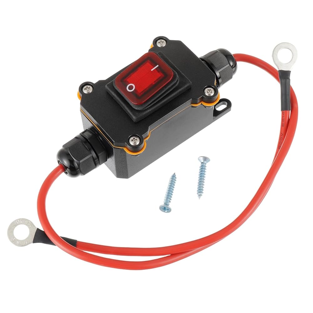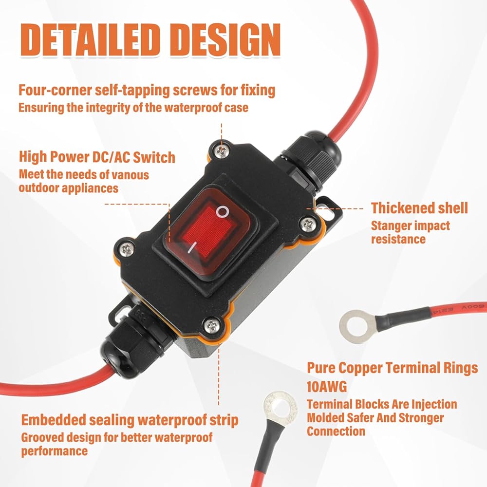 Product packaging: 1 DC inline waterproof power switch box (with copper rings at both ends, 30cm 10AWG cable each)+2 installation screws