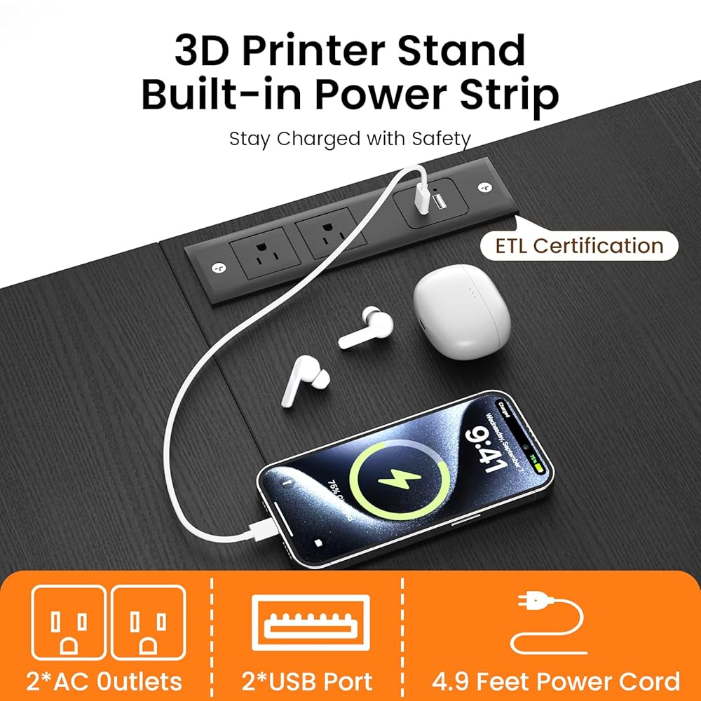 شريط طاقة مدمج لتوفير الراحة: تتميز طاولة الطابعة ثلاثية الأبعاد هذه بشريط طاقة مدمج مع منفذي تيار متردد ومنفذي USB، مما يعمل على تشغيل الطابعة ثلاثية الأبعاد والكمبيوتر المحمول والأدوات الأساسية في وقت واحد من أجل سير عمل سلس. يتيح سلك الطاقة بطول 4.9 قدم وضعًا مرنًا.
