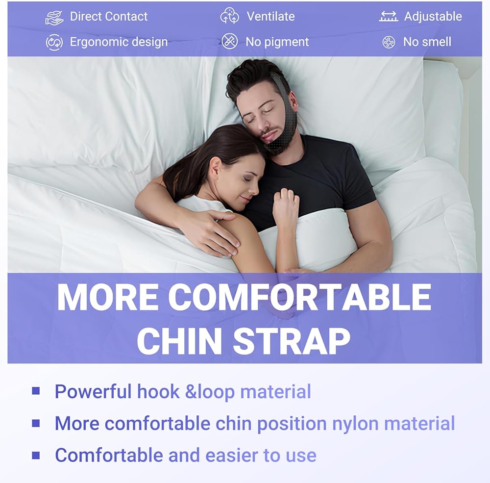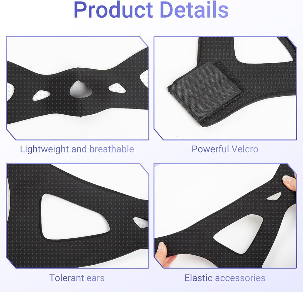 • دعم حزام الذقن CPAP: ملحق نوم أساسي لمستخدمي CPAP، يساعد حزام الفك هذا على الحفاظ على وضع الفم المغلق لمنع تسرب الهواء وزيادة كفاءة جهازك.