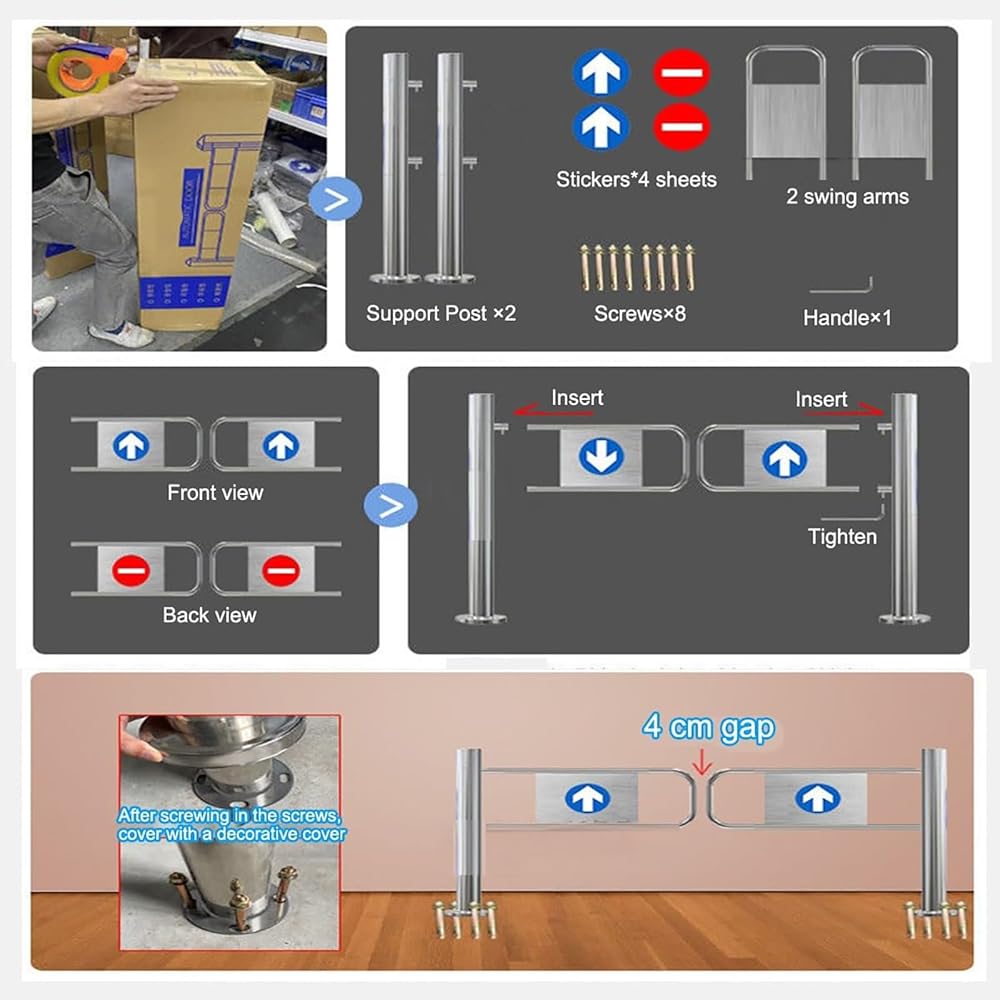 Discover the ultimate solution for secure and efficient access control with our Stainless Steel Automatic Swing Gate. Designed with a robust construction, this gate offers exceptional durability while minimizing the risk of breakage, making it perfect for high-traffic environments. Its ergonomic edge design not only enhances safety but also provides a comfortable user experience. Equipped with visible blue and red directional stickers, this gate facilitates seamless entry and exit flow, ensuring that customers and guests navigate effortlessly. With size options ranging from 39.4×39.4 inches to 78.7×39.4 inches, it caters to various settings, from cozy shops to expansive commercial complexes. The innovative split structure allows for quick and easy repairs or replacements, ensuring minimal downtime. The polished stainless steel finish not only boosts durability but also brings a contemporary aesthetic to any entrance. This gate is constructed with a thickened chassis secured by expansion screws, and features a decorative cover that hides fasteners, resulting in a clean and professional appearance. Perfect for a wide range of applications, our swing gate is ideal for supermarkets, warehouses, shopping malls, pedestrian zones, parks, industrial sites, restaurants, retail stores, movie theaters, schools, garages, and scenic attractions. Elevate your space with our Stainless Steel Automatic Swing Gate, combining functionality with style, and providing peace of mind with every use.