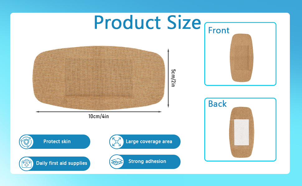 كبير جدًا: يبلغ مقاس هذه الضمادة القماشية المرنة حوالي 5 × 10 سم/ 2 × 4 بوصة ويمكن أن تغطي مساحة كبيرة، مما يوفر حماية قوية وطويلة الأمد للجروح؛ وهو لطيف على البشرة ولا يسبب الألم أو الانزعاج