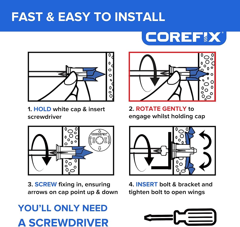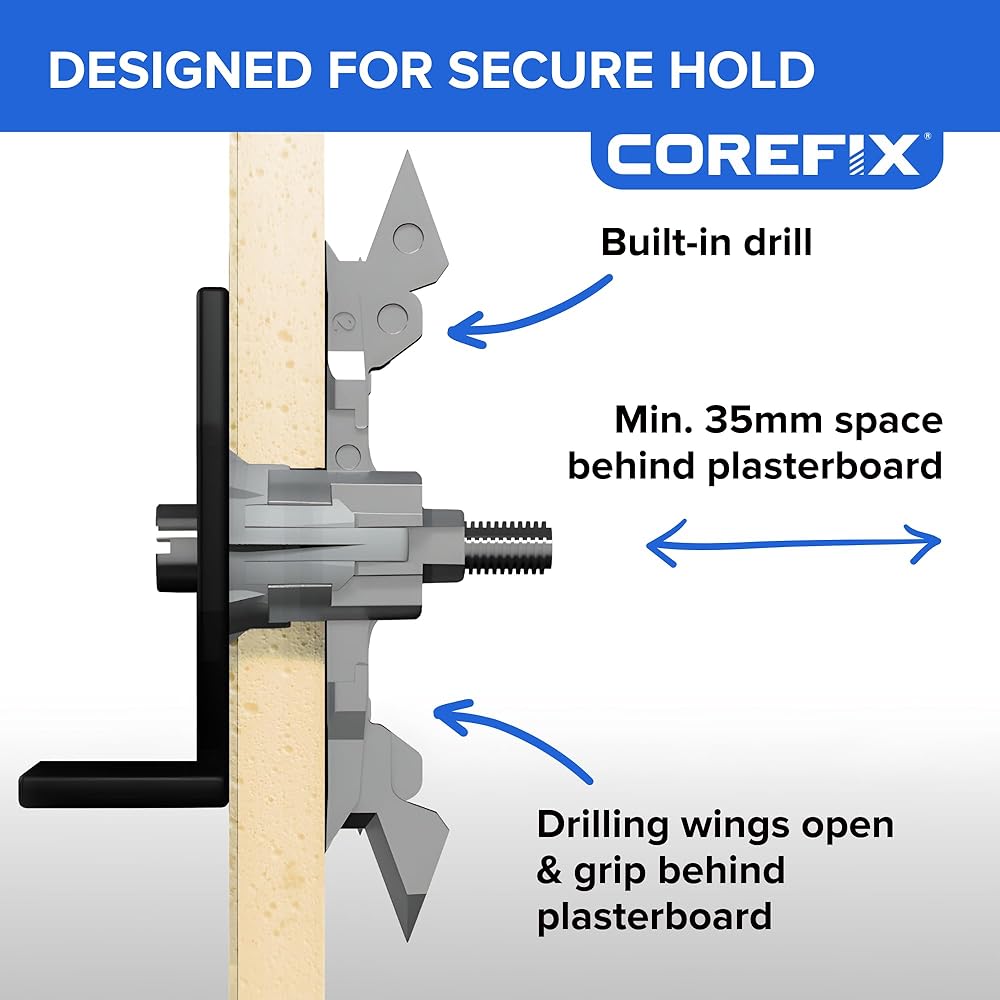COREFIX SPIKE: مجموعة مرساة للجدران الجافة شديدة التحمل لتركيبات ودعامات التلفزيون، سهلة التركيب باستخدام مفك براغي فقط دون الحاجة إلى ثقب مسبق. يتم قطع أجنحة الحفر بسهولة من خلال الحوائط الجافة وتفتح للإمساك بقوة خلفها، مما يوفر قوة تثبيت آمنة (الحمل الآمن 110 رطل). تتضمن هذه المجموعة أيضًا غسالات ومسامير آلة M5.