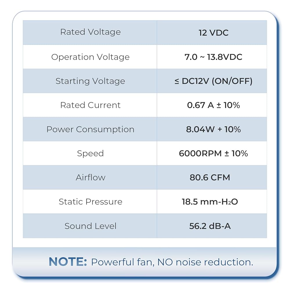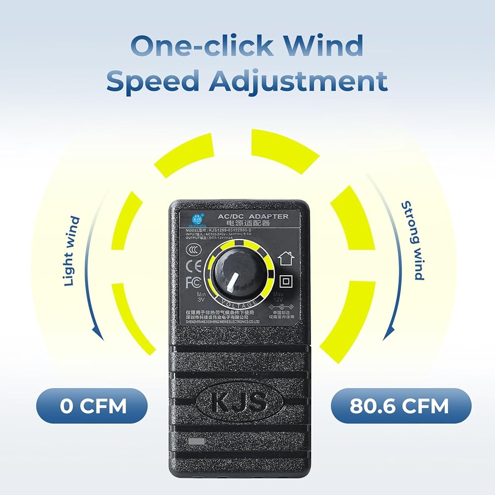 [تحكم في تدفق الهواء قابل للتعديل لأداء قوي] يتيح لك المفتاح الموجود على سلك الطاقة ضبط سرعة تدفق الهواء بسهولة لتناسب احتياجاتك. بضغطة واحدة، توفر المروحة ما يصل إلى 80.6 قدم مكعب في الدقيقة من تدفق الهواء القوي والمتسق، مما يجعلها مثالية لإزالة الحرارة والدخان بشكل فعال. ملاحظة: تعطي هذه المروحة عالية الأداء الأولوية لقوة تدفق الهواء ولا تتضمن ميزات تقليل الضوضاء.