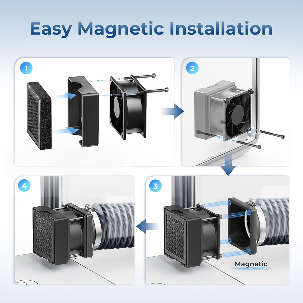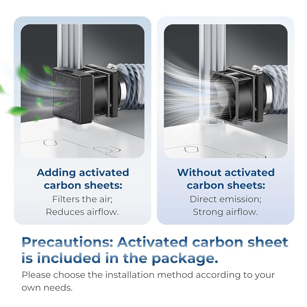 【ترشيح فعال للدخان والروائح】مجهز بطبقة من الكربون المنشط عالي الجودة، تساعد مجموعة فلتر العادم المغناطيسي على تقليل أبخرة الطباعة والجسيمات الدقيقة والروائح الكريهة، مما يخلق بيئة عمل أكثر نظافة وراحة. ملاحظة: يتم تقليل تدفق الهواء عند تثبيت فلتر الكربون. قم بإزالة الفلتر عند الحاجة إلى الحد الأقصى من تدفق الهواء.