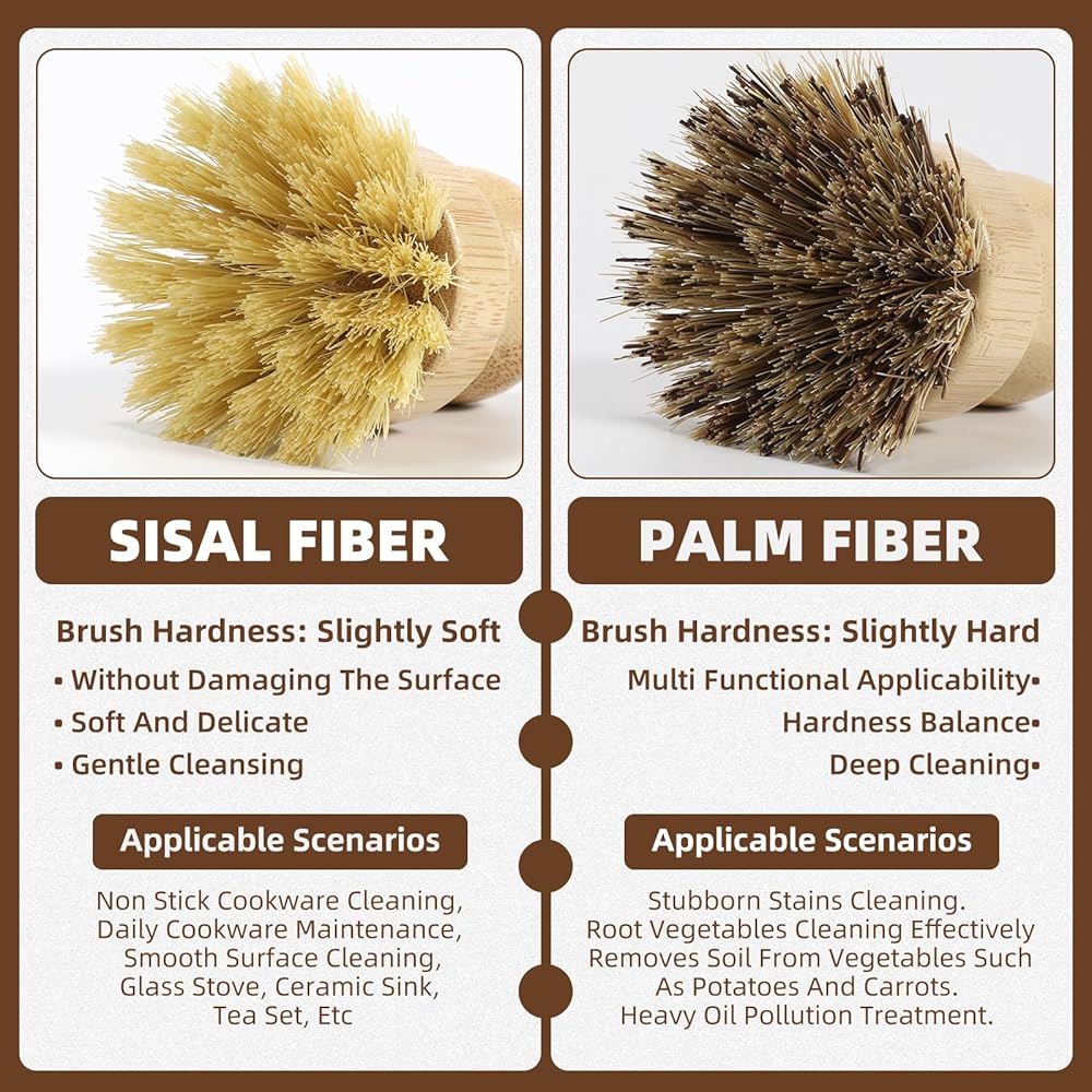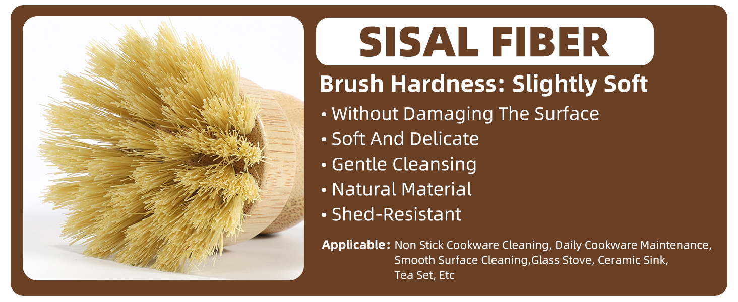 قوة شعيرات مزدوجة لمختلف الوظائف: شعيرات السيزال الناعمة تنظف الأطباق والأواني الزجاجية والأطباق بلطف دون خدش، في حين أن شعيرات ألياف النخيل الأكثر صلابة تعالج المقالي وألواح التقطيع والأطعمة المخبوزة بسهولة.