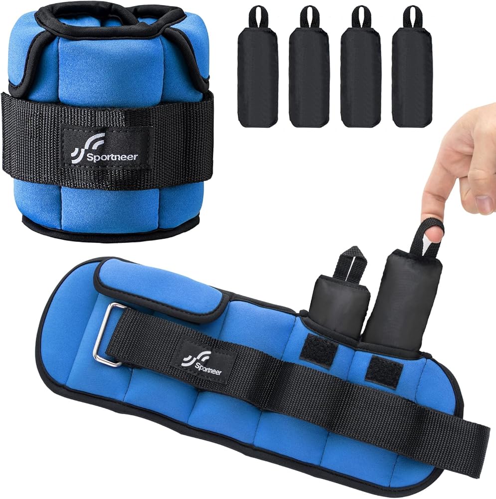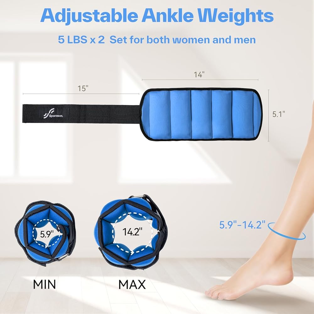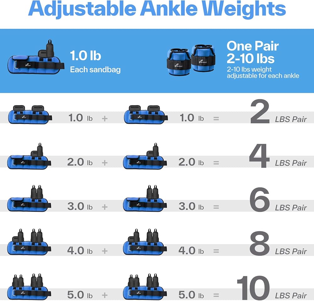 Optimized Adjustable Weight: The Sportneer upgraded ankle weights feature a new design with one fixed sandbag weight and four removable weights, allowing you to gradually increase the intensity according to your training needs. Each sandbag weighs 1 pound; each single weight can be adjusted from 1 to 5 lbs; and one pair of weights can be adjusted from 2 to 10 lbs by adding or reducing the sandbags.