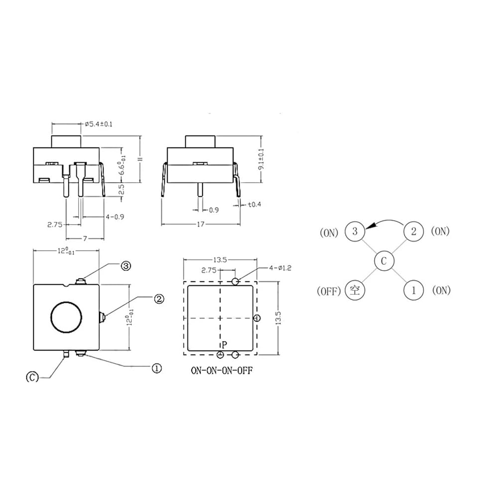 10PCS Push button switch, Power Button Switch 12mmx12mm H9mm 4PIN DIP ON-ON-ON-OFF For Flashlight Electric Torch