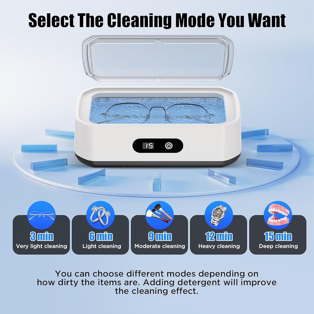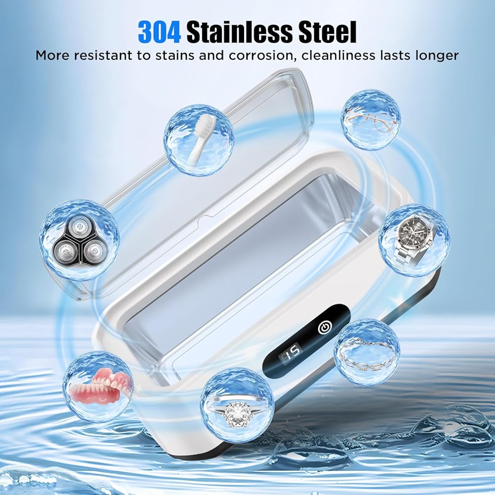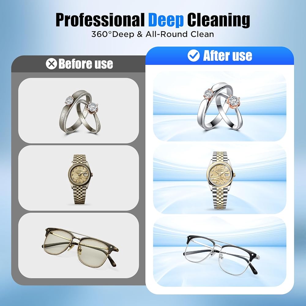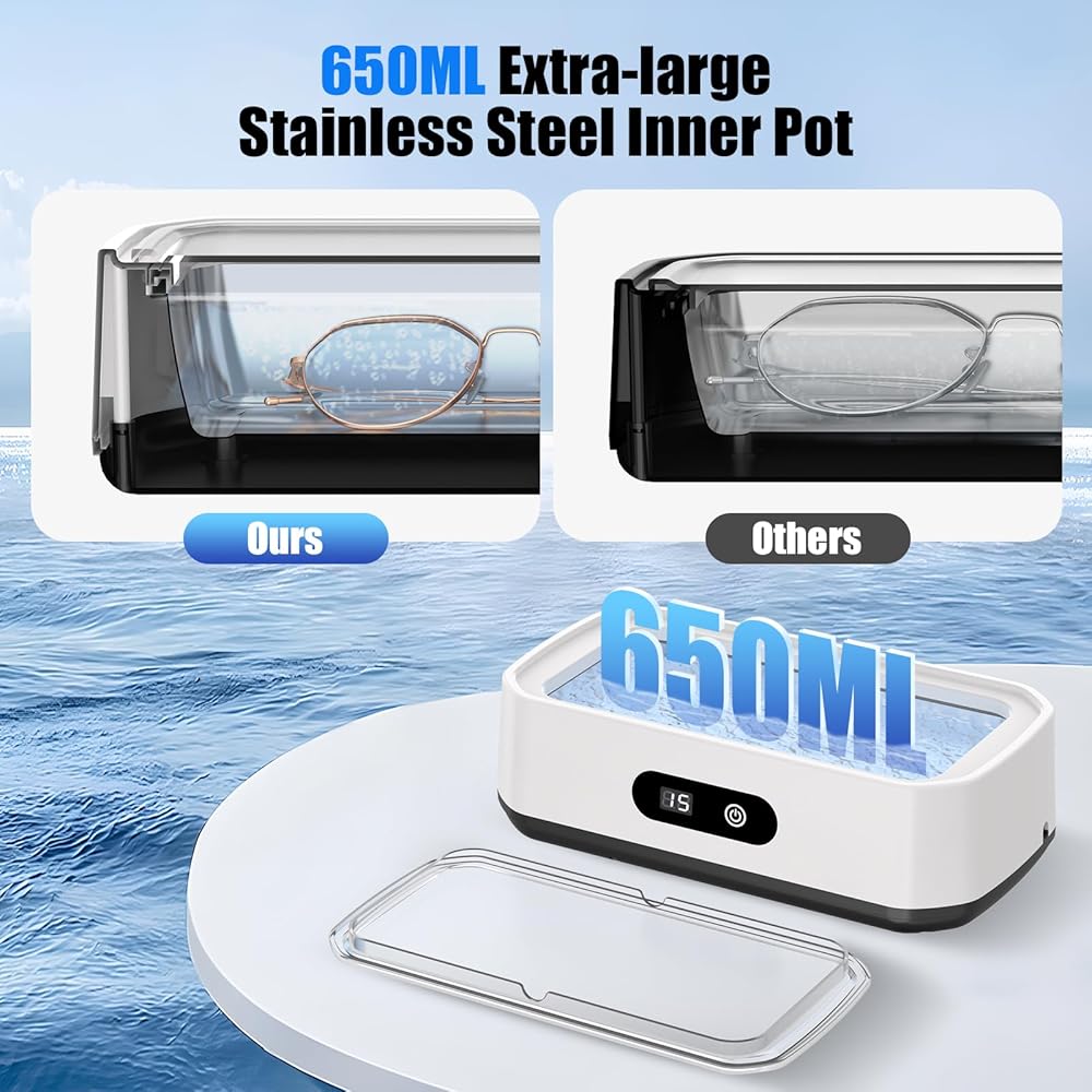 • منظف ​​بالموجات فوق الصوتية عالي الكفاءة: تولد الموجات فوق الصوتية القوية مليارات الفقاعات الدقيقة، وتنظف بعمق حتى الزوايا التي يصعب الوصول إليها، وتستعيد على الفور اللمعان والوضوح الرائع لمجوهراتك الثمينة ونظاراتك. استخدميه مع محلول التنظيف للحصول على نتائج مذهلة أكثر!
