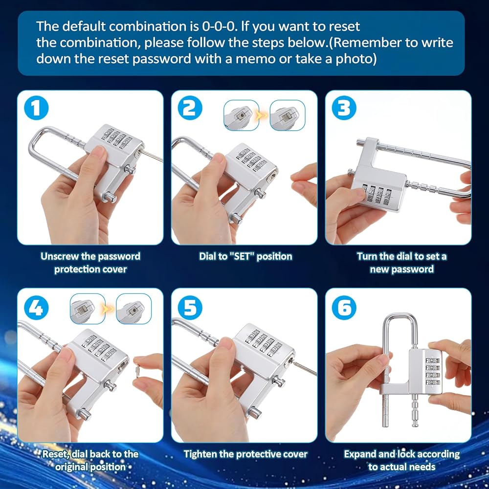 User-Focused Functionality: The lock incorporates several design elements for ease of use. A side window allows for clear viewing of the combination numbers from an angle, facilitating quicker unlocking. The Resettable Password Lock feature allows you to change the code to a new, memorable number as needed, which is useful for personalization or if you suspect the code has been seen by others. These features make the Adjustable Combination Lock practical for daily use.