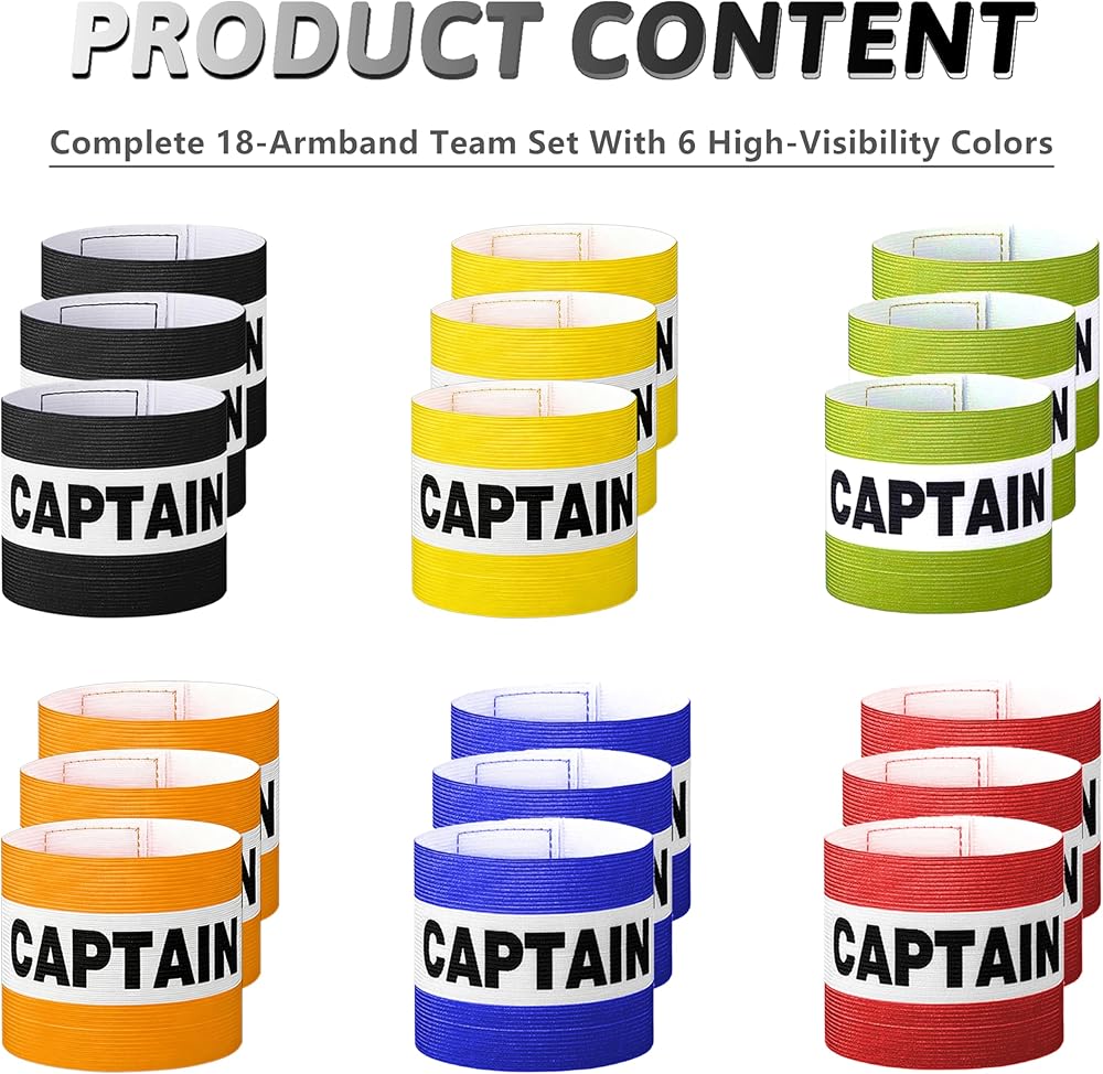 This 18-pack set includes captain armbands in 6 bright colors, with 3 bands per color for starters, substitutes, and backup use. A practical choice for soccer, football, rugby, school sports, tournaments, PE programs, and adult rec leagues.