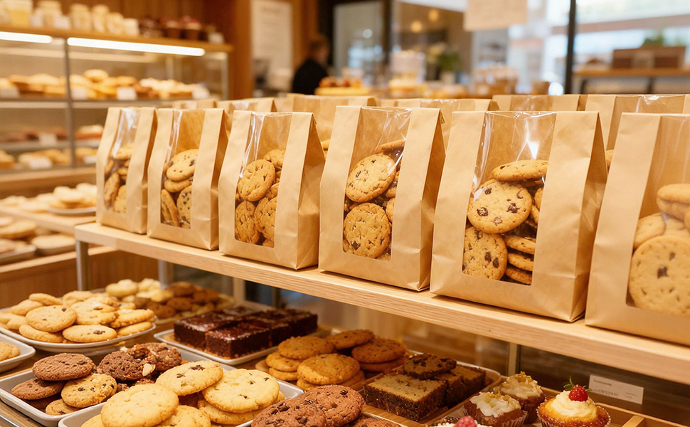 • تصميم نافذة شفافة: تتميز كل حقيبة مخبز بنافذة شفافة، مما يسمح لك برؤية البسكويت اللذيذ بالداخل بسهولة