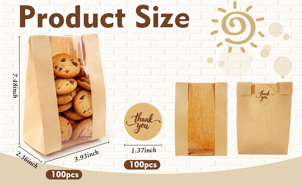 • أكياس البسكويت: تحتوي هذه المجموعة على 100 كيس بسكويت مصنوع من ورق الكرافت، رائع لتغليف البسكويت والحلوى والأطعمة الأخرى في أي مناسبة