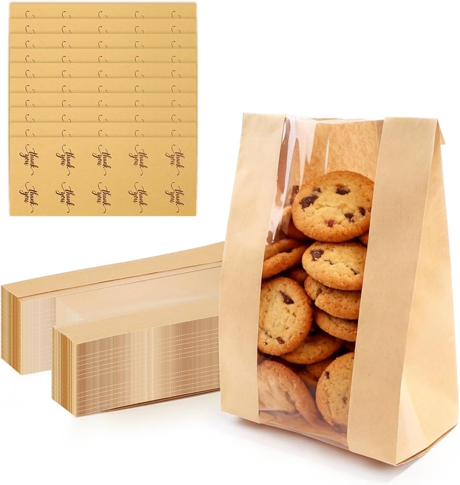 100 قطعة من أكياس البسكويت من WYTAOHZL مقاس 7.48 × 3.93 × 2.36 بوصة أكياس ورقية بنية مع ملصقات حقيبة مخبز كرافت مع نافذة للبسكويت والوجبات الخفيفة والحلوى in Kuwait