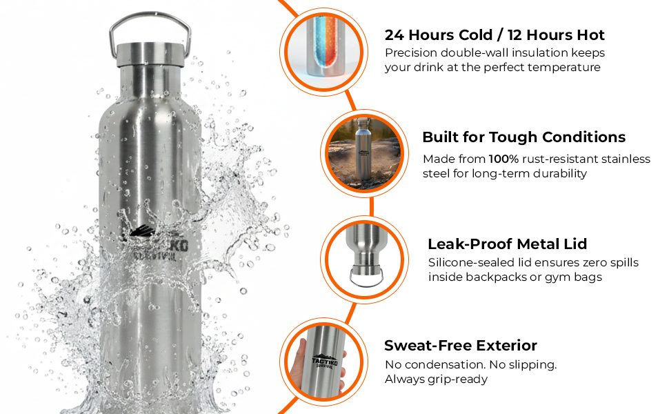 غطاء معدني بالكامل مانع للتسرب للاستخدام في الهواء الطلق: غطاء لولبي من الفولاذ المقاوم للصدأ مع مقبض وحلقة على شكل حرف O من السيليكون الخالي من مادة BPA تخلق ختمًا محكمًا؛ لا توجد أجزاء بلاستيكية، مقاومة للتسرب بنسبة 100%، ولا تحتوي على مواد بلاستيكية دقيقة - مثالية للتخييم أو المشي لمسافات طويلة أو صناعة الأدغال أو أدوات النجاة.
