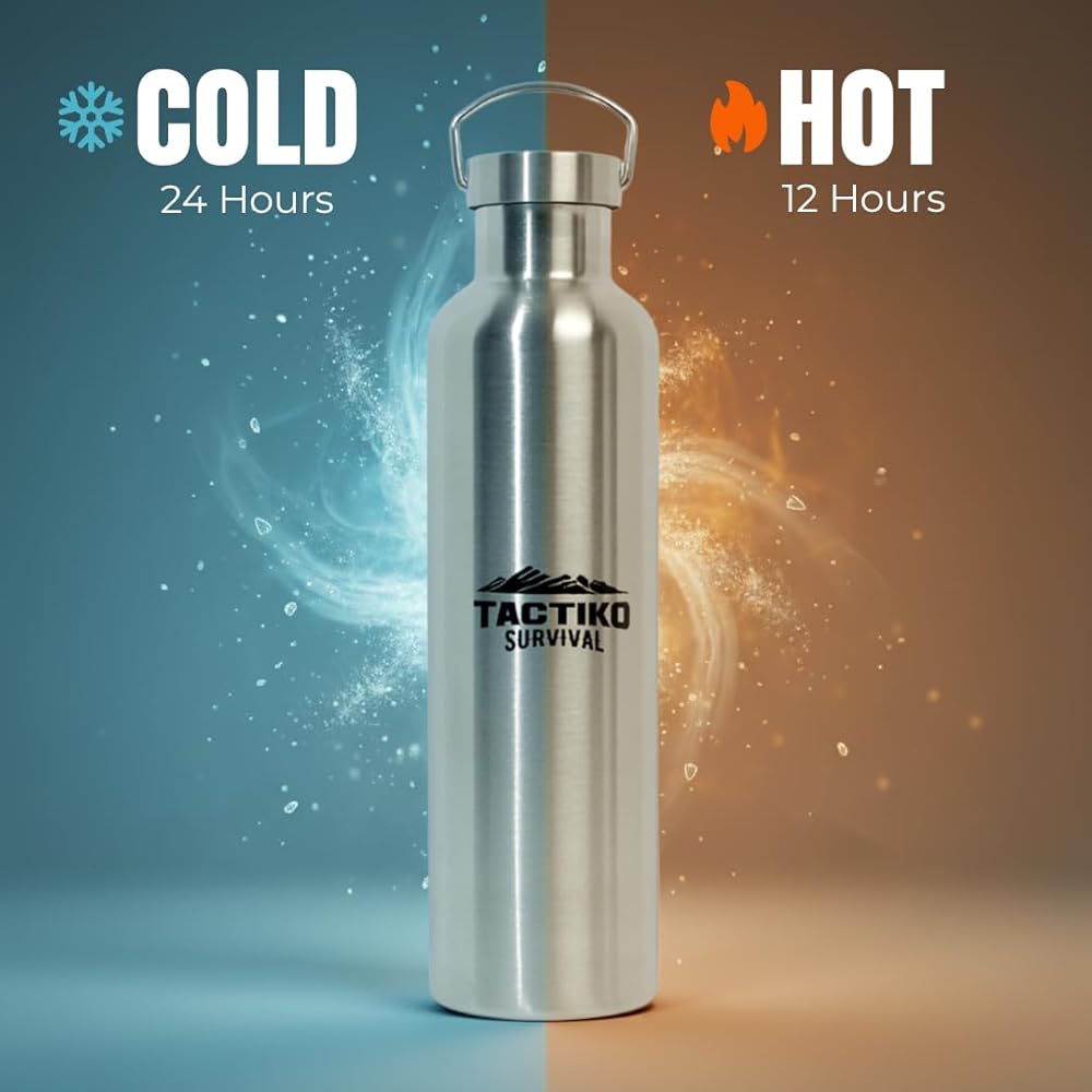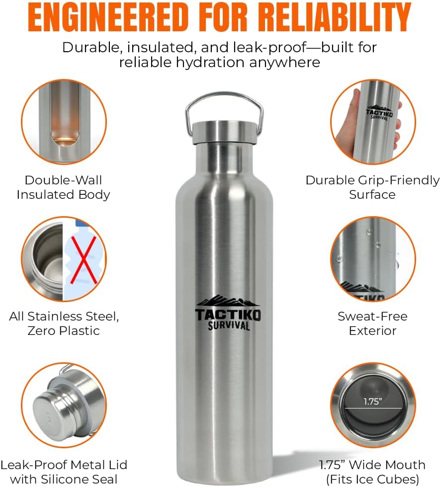 زجاجة مياه من الفولاذ المقاوم للصدأ معزولة بفم واسع سعة 1000 مل / 34 أونصة من تاكتيكو سيرفايفال، عزل مزدوج للجدار - مقاومة للتسرب، خالية من البيسفينول أ مع فرشاة تنظيف للتخييم والمشي لمسافات طويلة والإعداد في الهواء الطلق