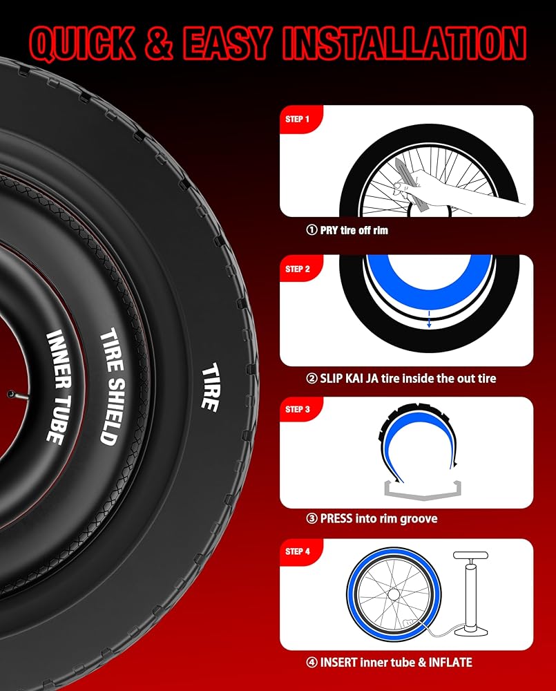 • 🧰 تركيب سريع وسهل بنفسك: لا تحتاج إلى أن تكون ميكانيكيًا أو تزور متجر دراجات! ببساطة قم بتفريغ الإطار الخاص بك، وقم بإزالة الإطار الخارجي والإطار الداخلي، ثم ضع إطار KAI JA الخاص بنا داخل الإطارات، ثم قم بنفخه مرة أخرى. الأمر بهذه السهولة. في أقل من 15 دقيقة، يمكنك تحويل دراجتك إلى آلة مقاومة للثقب والعودة مباشرة إلى مغامرتك.