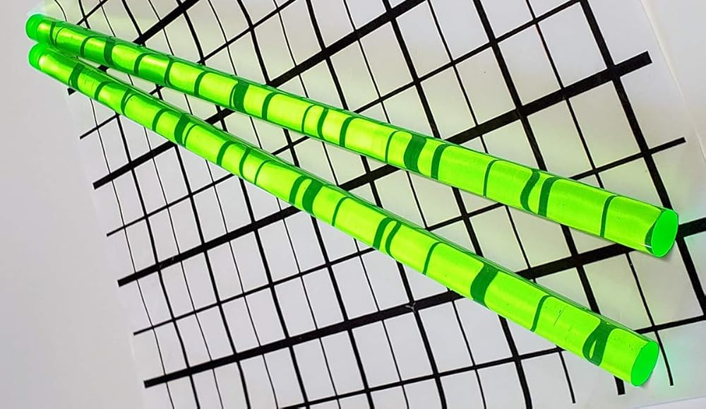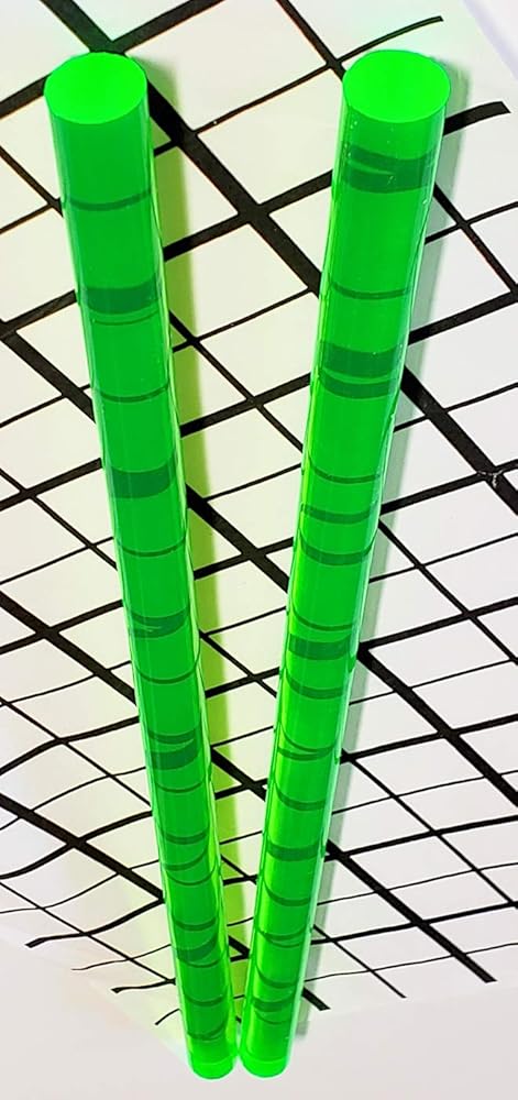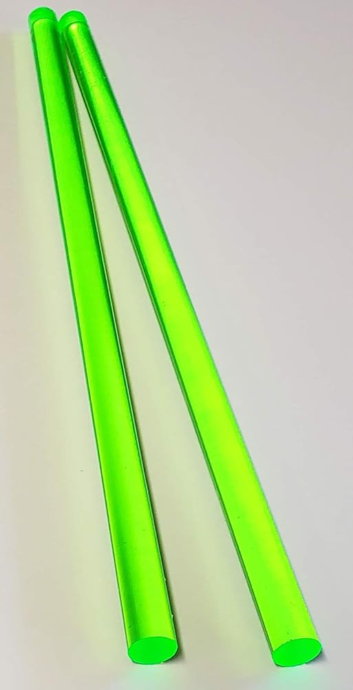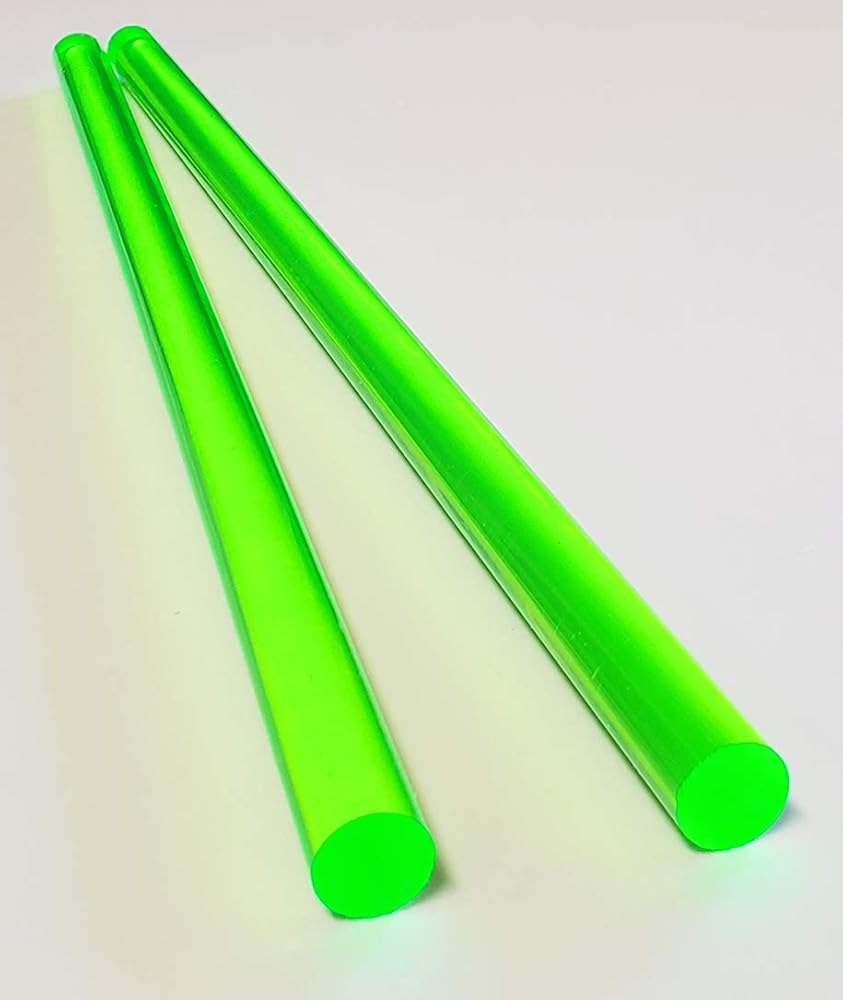 You are buying 2 (TWO) NEW 1/2" DIAMETER by 12" LONG GREEN FLUORESCENT TRANSLUCENT EXTRUDED ACRYLIC RODS (One Half inch Diameter x Twelve inch Long) As you can see from the picture of the rods on the black grid, these rods are semi-translucent. The color of the rods might vary depending on the back round color and light conditions due to being translucent. You are buying and will receive TWO GREEN FLUORESCENT TRANSLUCENT 1/2" x 12" rods. To assure that you get the finest quality, the protective sleeve is kept in place on the rods while being cut to protect the acrylic. All rods have saw cut edges on both ends. Please allow a tolerance of +/- 1/16" on all pieces. Distributed by Best Acrylics