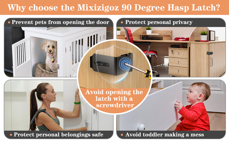 مادة الفولاذ المقاوم للصدأ 304: قفل بمشبك 90 درجة من Mixizigoz مصنوع من الفولاذ المقاوم للصدأ مع سطح مصقول وصلابة عالية. مزلاج الباب مضاد للخدش، ومضاد للصدأ، ومقاوم للتآكل، ومتين ويدوم لفترة طويلة.
