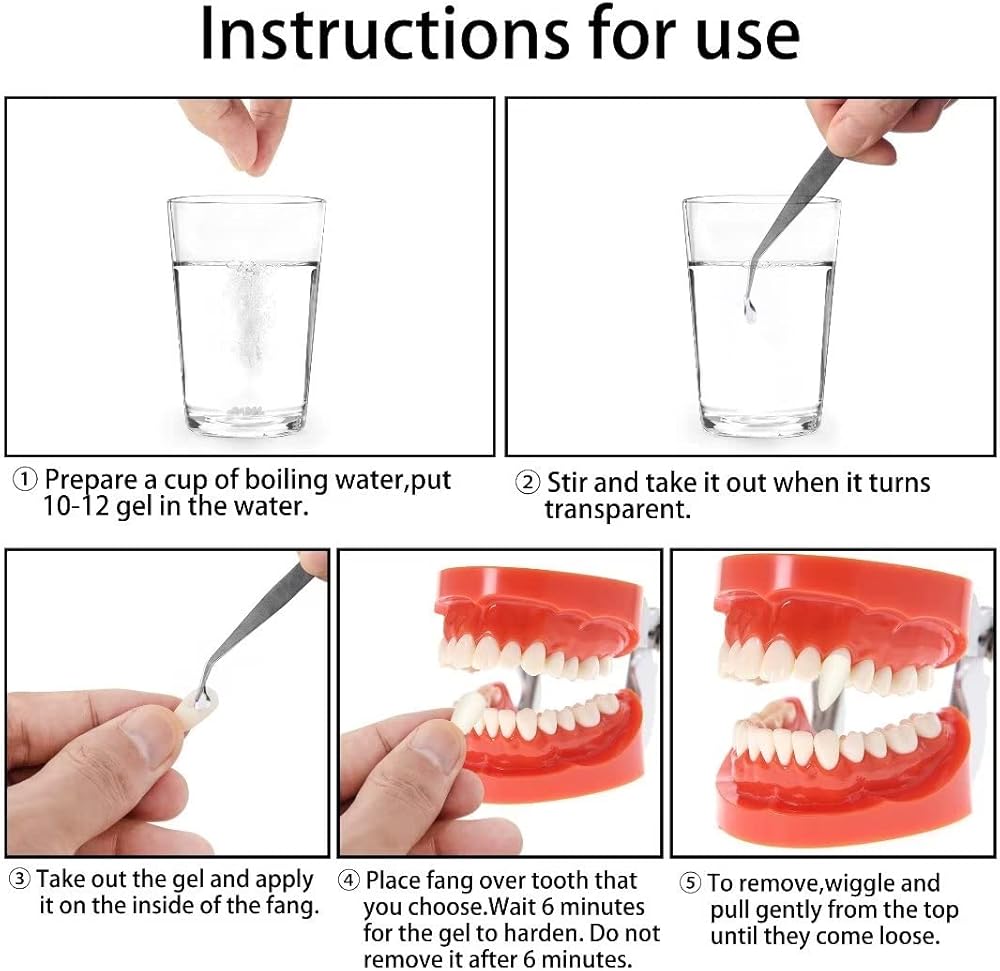 كيفية الاستخدام: استخدم الماء الساخن لتسخين الخرز اللاصق للأسنان من اللون الأبيض إلى الشفاف، ثم اغرفها واضغط على أسنانك، وأخيرًا أخرج الأسنان المزيفة واضغط عليها على اللاصق لفترة من الوقت.